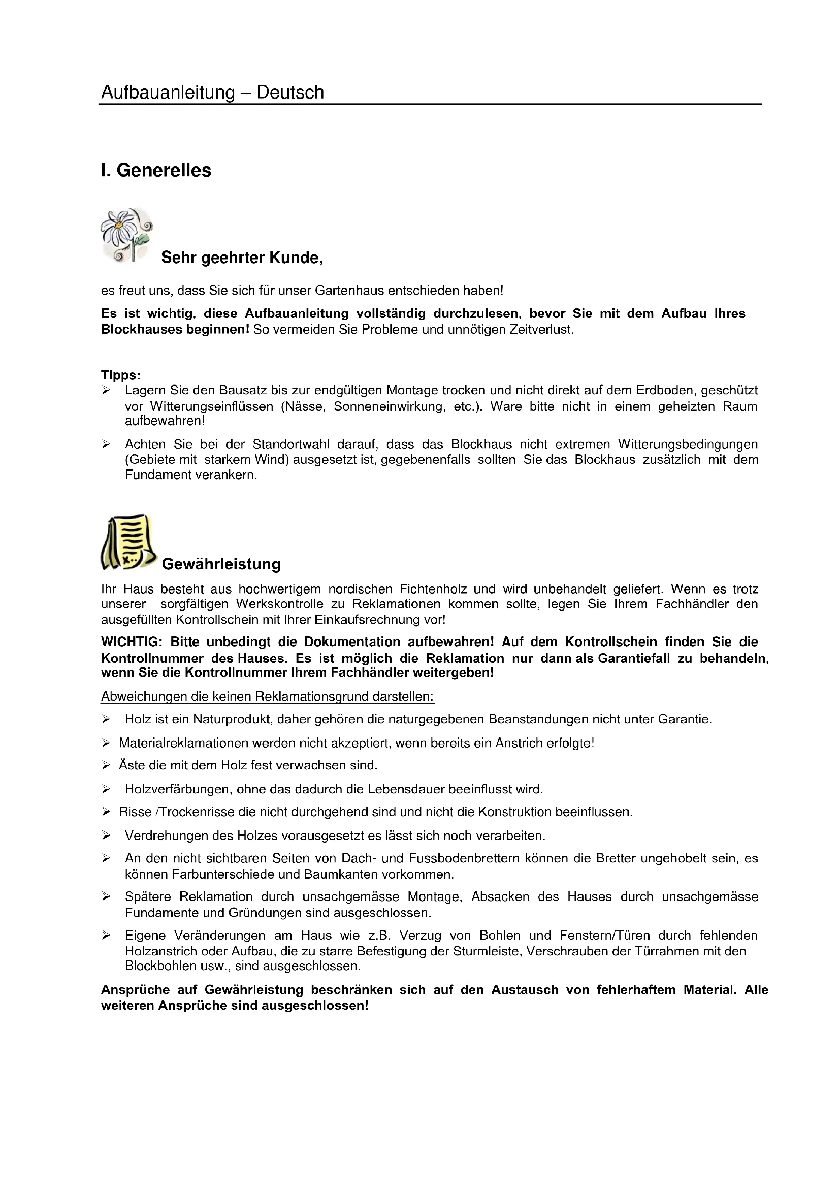 Sehr geehrter Kunde, es freut uns, dass Sie sich für unser Gartenhaus entschieden haben! Es ist wichtig, diese Aufbauanleitung vollständig durchzulesen, bevor Sie mit dem Aufbau Ihres Blockhauses beginnen! So vermeiden Sie Probleme und unnötigen Zeitverlust. Tipps: Lagern Sie den Bausatz bis zur endgültigen Montage trocken und nicht direkt auf dem Erdboden, geschützt vor Witterungseinflüssen (Nässe, Sonneneinwirkung, etc.). Ware bitte nicht in einem geheizten Raum aufbewahren! Achten Sie bei der Standortwahl darauf, dass das Blockhaus nicht extremen Witterungsbedingungen (Gebiete mit starkem Wind) ausgesetzt ist, gegebenenfalls sollten Sie das Blockhaus zusätzlich mit dem Fundament verankern. Gewährleistung Ihr Haus besteht aus hochwertigem nordischen Fichtenholz und wird unbehandelt geliefert. Wenn es trotz unserer sorgfältigen Werkskontrolle zu Reklamationen kommen sollte, legen Sie Ihrem Fachhändler den ausgefüllten Kontrollschein mit Ihrer Einkaufsrechnung vor! WICHTIG: Bitte unbedingt die Dokumentation aufbewahren! Auf dem Kontrollschein finden Sie die Kontrollnummer des Hauses. Es ist möglich die Reklamation nur dann als Garantiefall zu behandeln, wenn Sie die Kontrollnummer Ihrem Fachhändler weitergeben! Abweichungen die keinen Reklamationsgrund darstellen: Holz ist ein Naturprodukt, daher gehören die naturgegebenen Beanstandungen nicht unter Garantie. Materialreklamationen werden nicht akzeptiert, wenn bereits ein Anstrich erfolgte! Äste die mit dem Holz fest verwachsen sind. Holzverfärbungen, ohne das dadurch die Lebensdauer beeinflusst wird. Risse /Trockenrisse die nicht durchgehend sind und nicht die Konstruktion beeinflussen. Verdrehungen des Holzes vorausgesetzt es lässt sich noch verarbeiten. An den nicht sichtbaren Seiten von Dach- und Fussbodenbrettern können die Bretter ungehobelt sein, es können Farbunterschiede und Baumkanten vorkommen. Spätere Reklamation durch unsachgemässe Montage, Absacken des Hauses durch unsachgemässe Fundamente und Gründungen sind ausgeschlossen. Eigene Veränderungen am Haus wie z.B. Verzug von Bohlen und Fenstern/Türen durch fehlenden Holzanstrich oder Aufbau, die zu starre Befestigung der Sturmleiste, Verschrauben der Türrahmen mit den Blockbohlen usw., sind ausgeschlossen. Ansprüche auf Gewährleistung beschränken sich auf den Austausch von fehlerhaftem Material. Alle weiteren Ansprüche sind ausgeschlossen!Aufbauanleitung – Deutsch