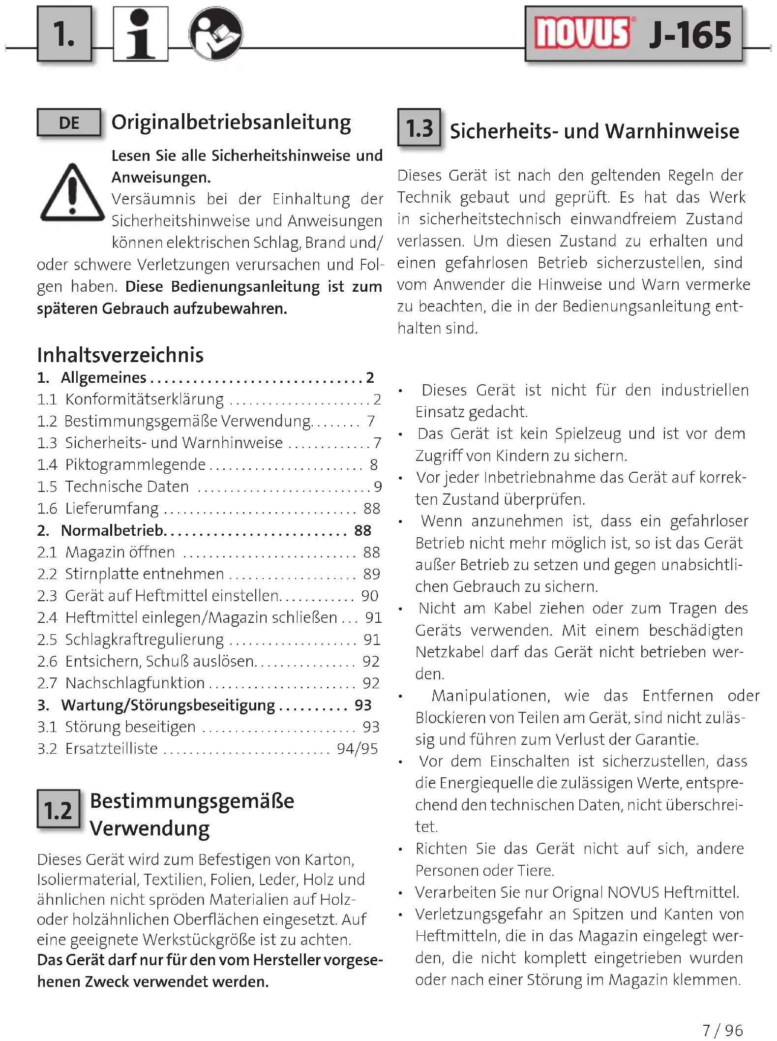 - Richten Sie das Gerät nicht auf sich, andere Personen oder Tiere.• Verarbeiten Sie nur Orignal NOVUS Heftmittel. • Verletzungsgefahr an Spitzen und Kanten von Heftmitteln, die in das Magazin eingelegt wer-den, die nicht komplett eingetrieben wurden oder nach einer Störung im Magazin klemmen.8 / 96