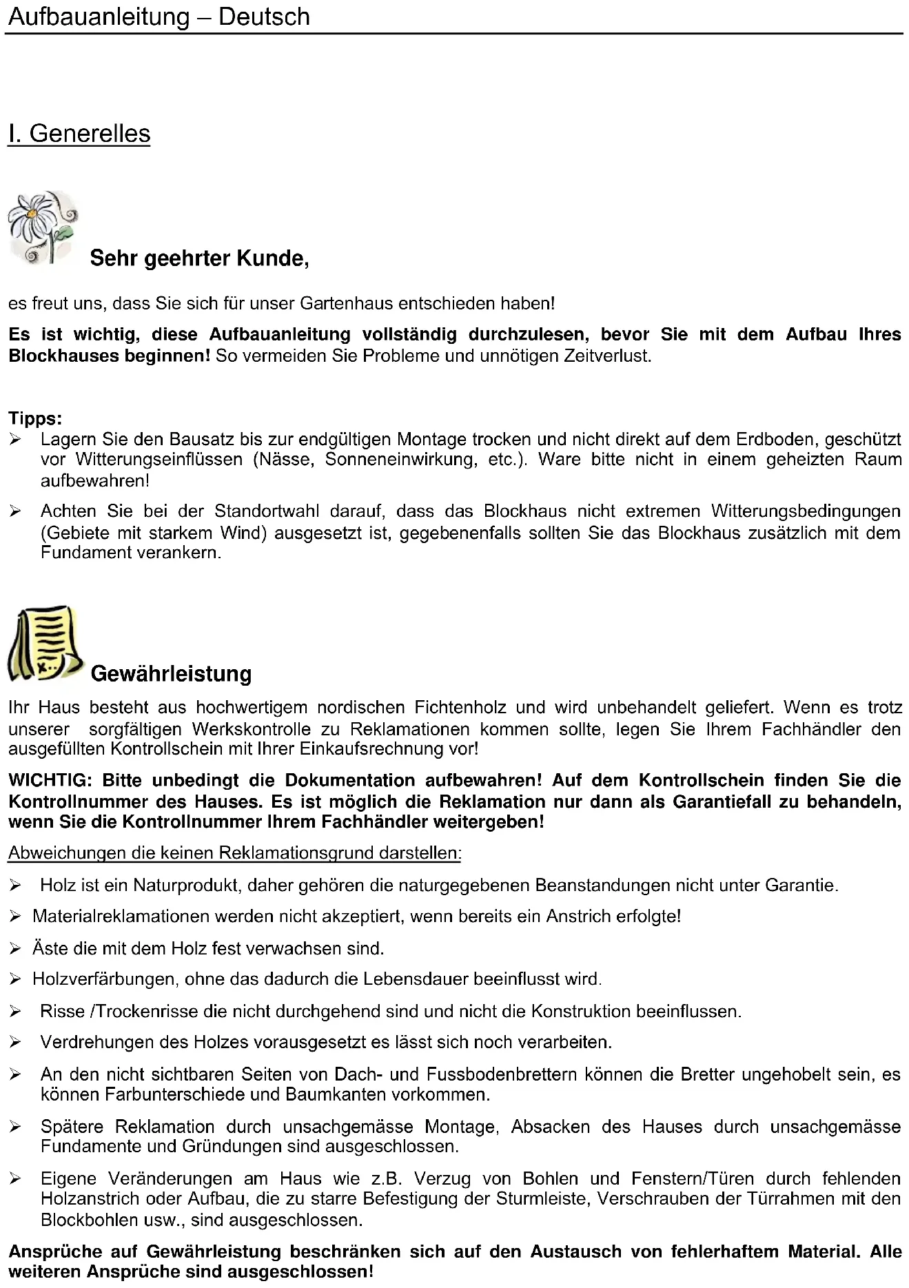 Sehr geehrter Kunde, es freut uns, dass Sie sich für unser Gartenhaus entschieden haben! Es ist wichtig, diese Aufbauanleitung vollständig durchzulesen, bevor Sie mit dem Aufbau Ihres Blockhauses beginnen! So vermeiden Sie Probleme und unnötigen Zeitverlust. Tipps: Lagern Sie den Bausatz bis zur endgültigen Montage trocken und nicht direkt auf dem Erdboden, geschützt vor Witterungseinflüssen (Nässe, Sonneneinwirkung, etc.). Ware bitte nicht in einem geheizten Raum aufbewahren! Achten Sie bei der Standortwahl darauf, dass das Blockhaus nicht extremen Witterungsbedingungen (Gebiete mit starkem Wind) ausgesetzt ist, gegebenenfalls sollten Sie das Blockhaus zusätzlich mit dem Fundament verankern. Gewährleistung Ihr Haus besteht aus hochwertigem nordischen Fichtenholz und wird unbehandelt geliefert. Wenn es trotz unserer sorgfältigen Werkskontrolle zu Reklamationen kommen sollte, legen Sie Ihrem Fachhändler den ausgefüllten Kontrollschein mit Ihrer Einkaufsrechnung vor! WICHTIG: Bitte unbedingt die Dokumentation aufbewahren! Auf dem Kontrollschein finden Sie die Kontrollnummer des Hauses. Es ist möglich die Reklamation nur dann als Garantiefall zu behandeln, wenn Sie die Kontrollnummer Ihrem Fachhändler weitergeben! Abweichungen die keinen Reklamationsgrund darstellen: Holz ist ein Naturprodukt, daher gehören die naturgegebenen Beanstandungen nicht unter Garantie. Materialreklamationen werden nicht akzeptiert, wenn bereits ein Anstrich erfolgte! Äste die mit dem Holz fest verwachsen sind. Holzverfärbungen, ohne das dadurch die Lebensdauer beeinflusst wird. Risse /Trockenrisse die nicht durchgehend sind und nicht die Konstruktion beeinflussen. Verdrehungen des Holzes vorausgesetzt es lässt sich noch verarbeiten. An den nicht sichtbaren Seiten von Dach- und Fussbodenbrettern können die Bretter ungehobelt sein, es können Farbunterschiede und Baumkanten vorkommen. Spätere Reklamation durch unsachgemässe Montage, Absacken des Hauses durch unsachgemässe Fundamente und Gründungen sind ausgeschlossen. Eigene Veränderungen am Haus wie z.B. Verzug von Bohlen und Fenstern/Türen durch fehlenden Holzanstrich oder Aufbau, die zu starre Befestigung der Sturmleiste, Verschrauben der Türrahmen mit den Blockbohlen usw., sind ausgeschlossen. Ansprüche auf Gewährleistung beschränken sich auf den Austausch von fehlerhaftem Material. Alle weiteren Ansprüche sind ausgeschlossen!Aufbauanleitung – Deutsch