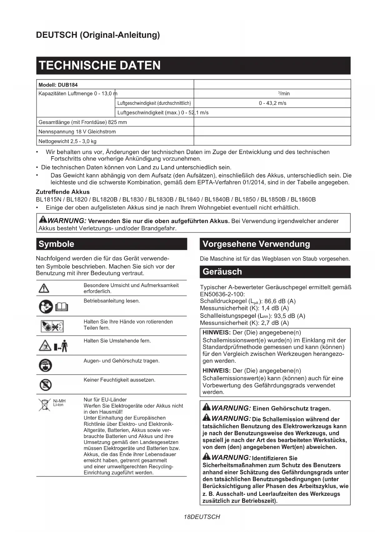 - EinigederobenaufgelistetenAkkussindjenachIhremWohngebieteventuellnichterhältlich. WARNUNG: Verwenden Sie nur die oben aufgeführten Akkus. Bei Verwendung irgendwelcher anderer AkkusbestehtVerletzungs-und/oderBrandgefahr. Symbole Nachfolgend werden die für das Gerät verwende- tenSymbolebeschrieben.MachenSiesichvorder Benutzung mit ihrer Bedeutung vertraut. Besondere Umsicht und Aufmerksamkeit erforderlich. Betriebsanleitunglesen. Halten Sie Ihre Hände von rotierenden Teilen fern. Halten Sie Umstehende fern. Augen- und Gehörschutz tragen. Keiner Feuchtigkeit aussetzen. Ni-MH Li-ion NurfürEU-Länder WerfenSieElektrogeräteoderAkkusnicht in den Hausmüll! UnterEinhaltungderEuropäischen RichtlinieüberElektro-undElektronik- Altgeräte, Batterien, Akkus sowie ver- brauchteBatterienundAkkusundihre UmsetzunggemäßdenLandesgesetzen müssenElektrogeräteundBatterienbzw. Akkus,diedasEndeihrerLebensdauer erreichthaben,getrenntgesammelt undeinerumweltgerechtenRecycling- Einrichtungzugeführtwerden. Vorgesehene Verwendung DieMaschineistfürdasWegblasenvonStaubvorgesehen. Geräusch TypischerA-bewerteterGeräuschpegelermitteltgemäß EN50636-2-100: Schalldruckpegel (L
