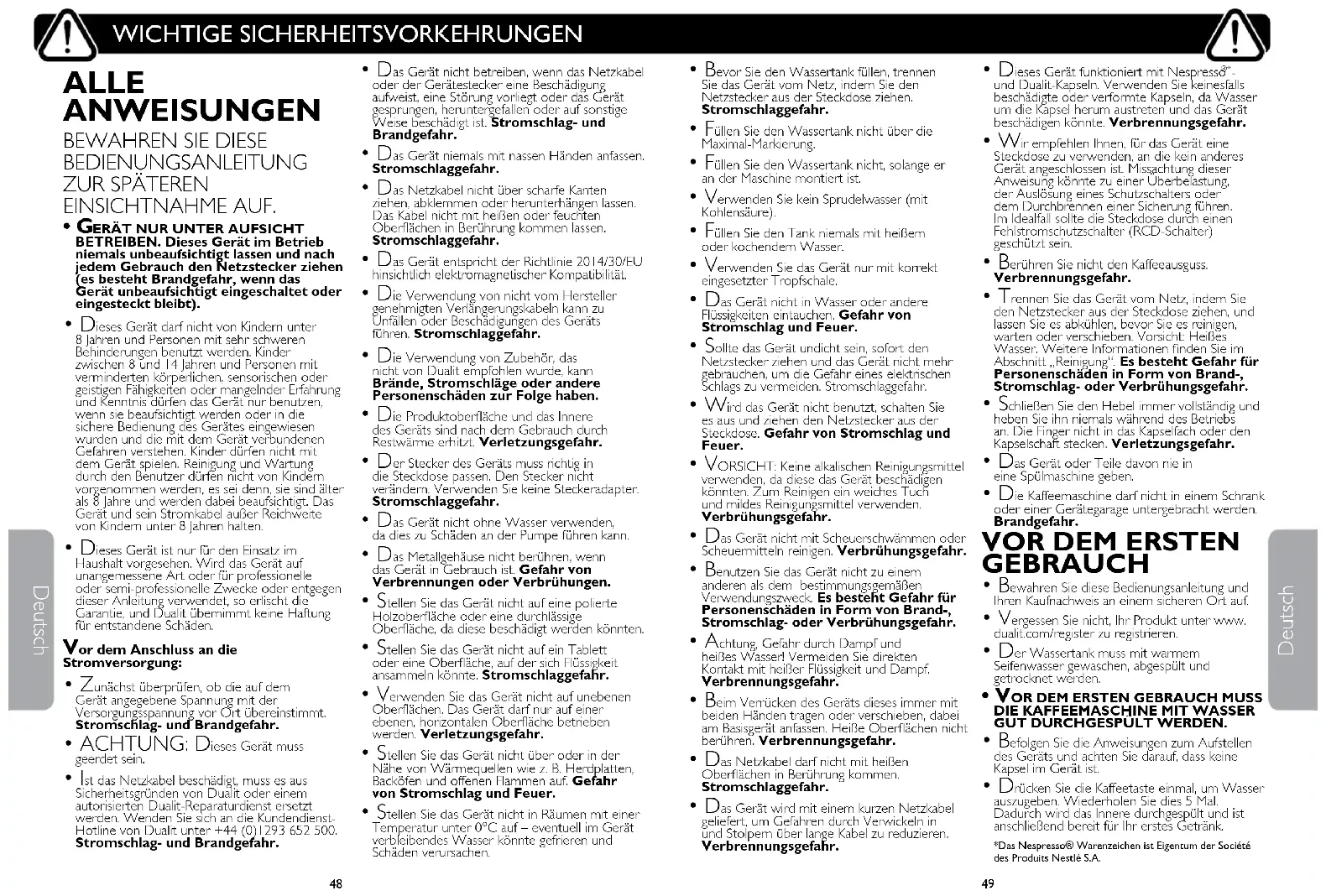 - Dieses Gerät ist nur für den Einsatz im Haushalt vorgesehen. Wird das Gerät auf unangemessene Art oder für professionelle oder semi-professionelle Zwecke oder entgegen dieser Anleitung verwendet, so erlischt die Garantie, und Dualit übernimmt keine Haftung für entstandene Schäden. Vor dem Anschluss an die Stromversorgung: