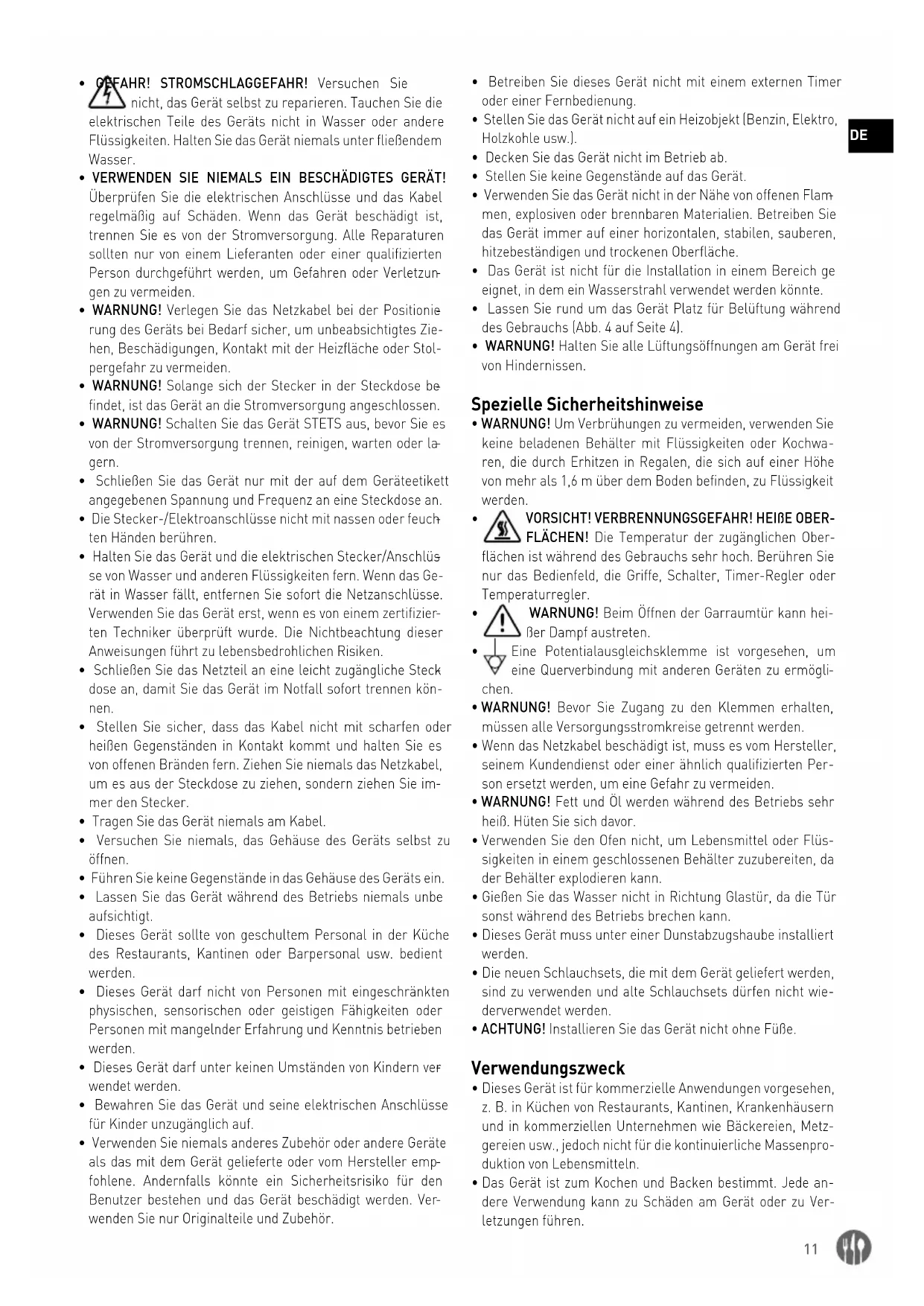 VORSICHT! VERBRENNUNGSGEFAHR! HEIßE OBER- FLÄCHEN! Die Temperatur der zugänglichen Ober- flächen ist während des Gebrauchs sehr hoch. Berühren Sie nur das Bedienfeld, die Griffe, Schalter, Timer-Regler oder Temperaturregler.
