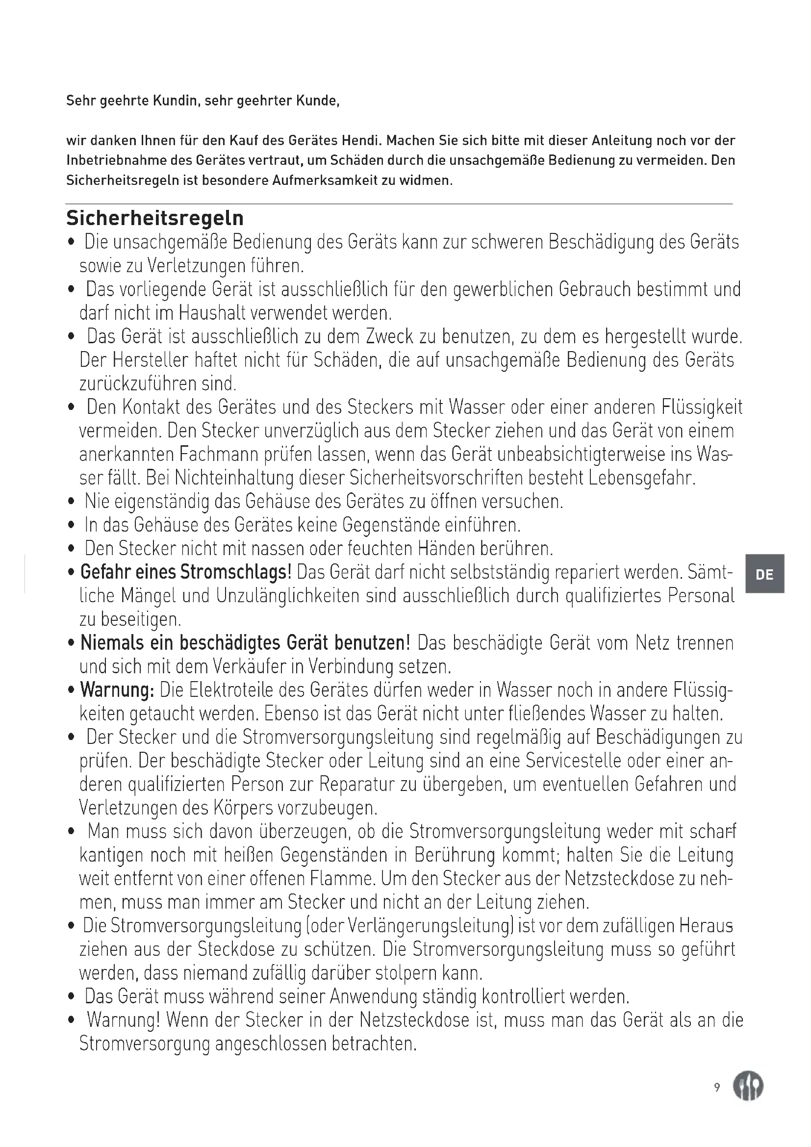 Sehr geehrte Kundin, sehr geehrter Kunde, wir danken Ihnen für den Kauf des Gerätes Hendi. Machen Sie sich bitte mit dieser Anleitung noch vor der Inbetriebnahme des Gerätes vertraut, um Schäden durch die unsachgemäße Bedienung zu vermeiden. Den Sicherheitsregeln ist besondere Aufmerksamkeit zu widmen. Sicherheitsregeln