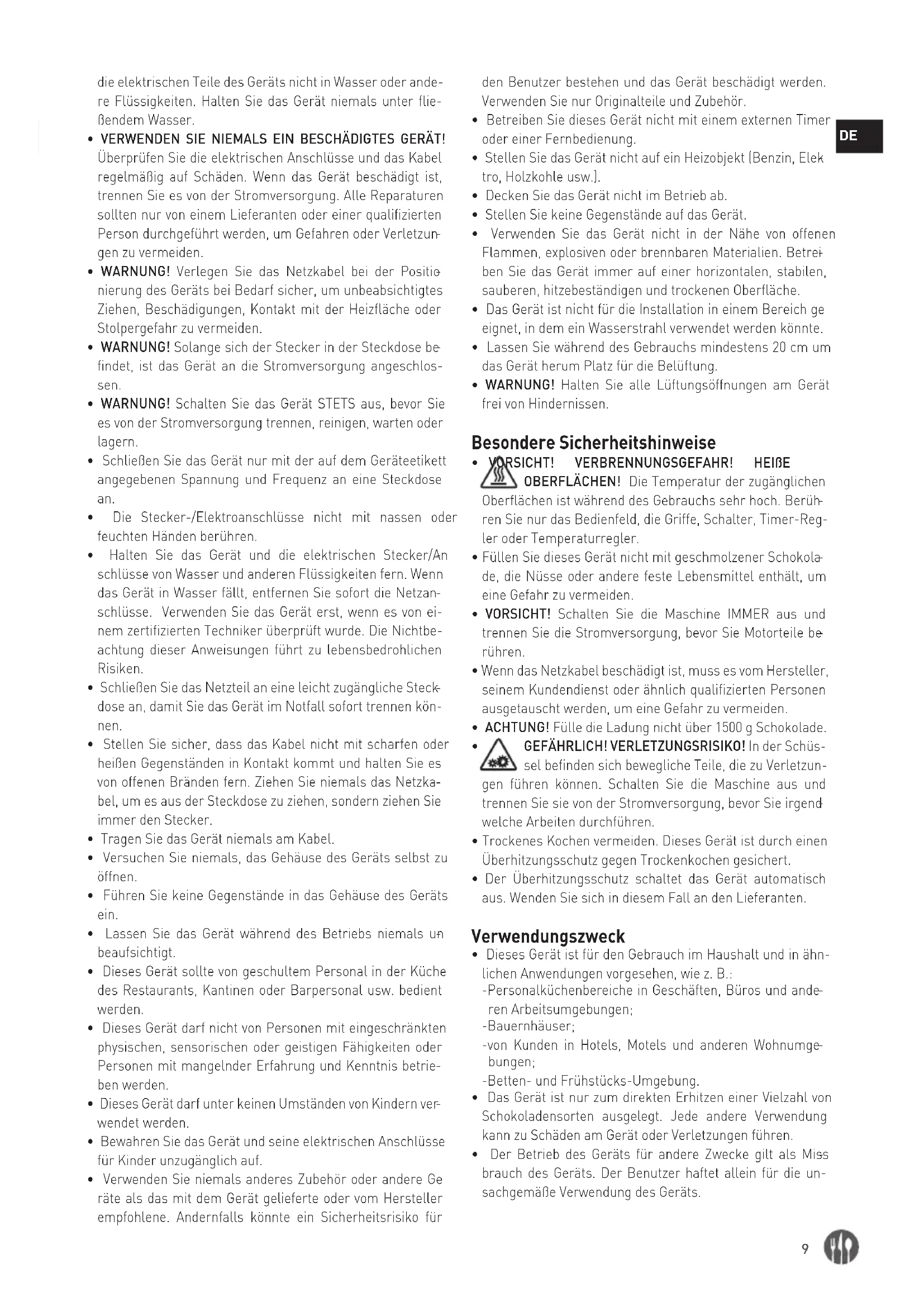 - Das Gerät ist nur zum direkten Erhitzen einer Vielzahl von Schokoladensorten ausgelegt. Jede andere Verwendung kann zu Schäden am Gerät oder Verletzungen führen.