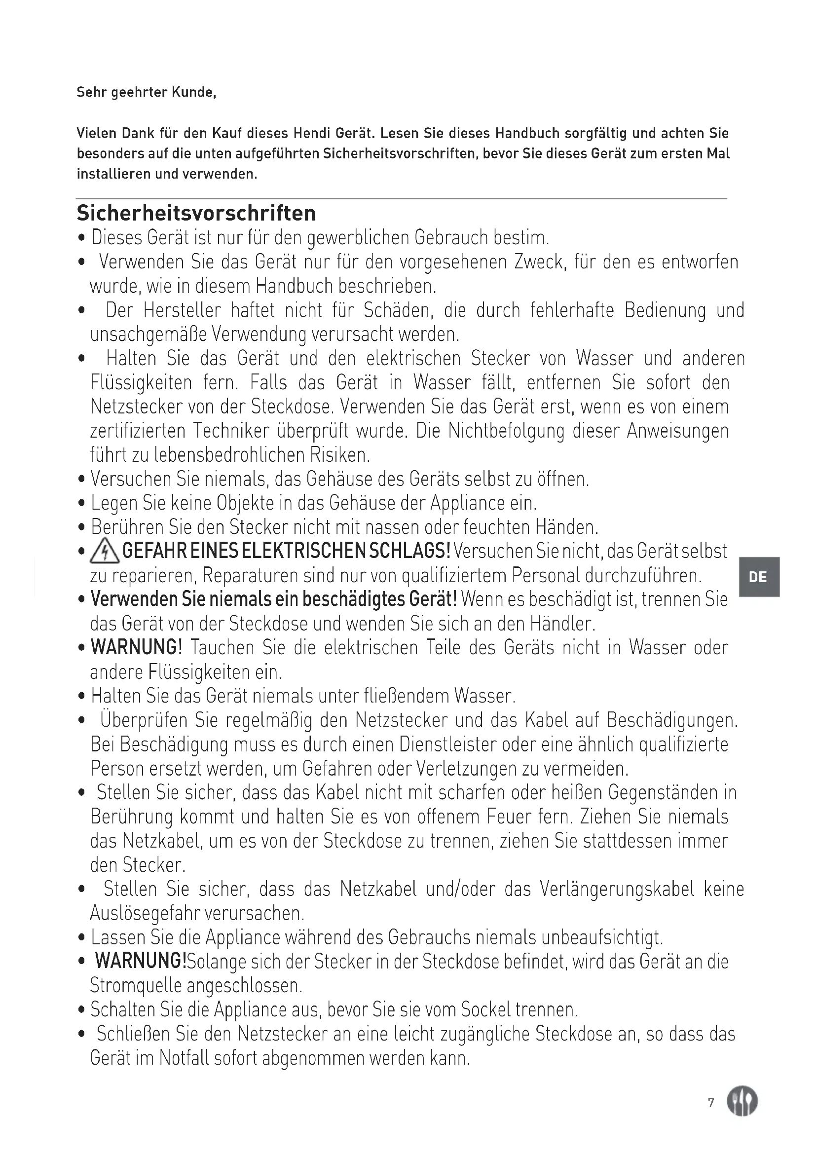 Sehr geehrter Kunde, Vielen Dank für den Kauf dieses Hendi Gerät. Lesen Sie dieses Handbuch sorgfältig und achten Sie besonders auf die unten aufgeführten Sicherheitsvorschriften, bevor Sie dieses Gerät zum ersten Mal installieren und verwenden. Sicherheitsvorschriften