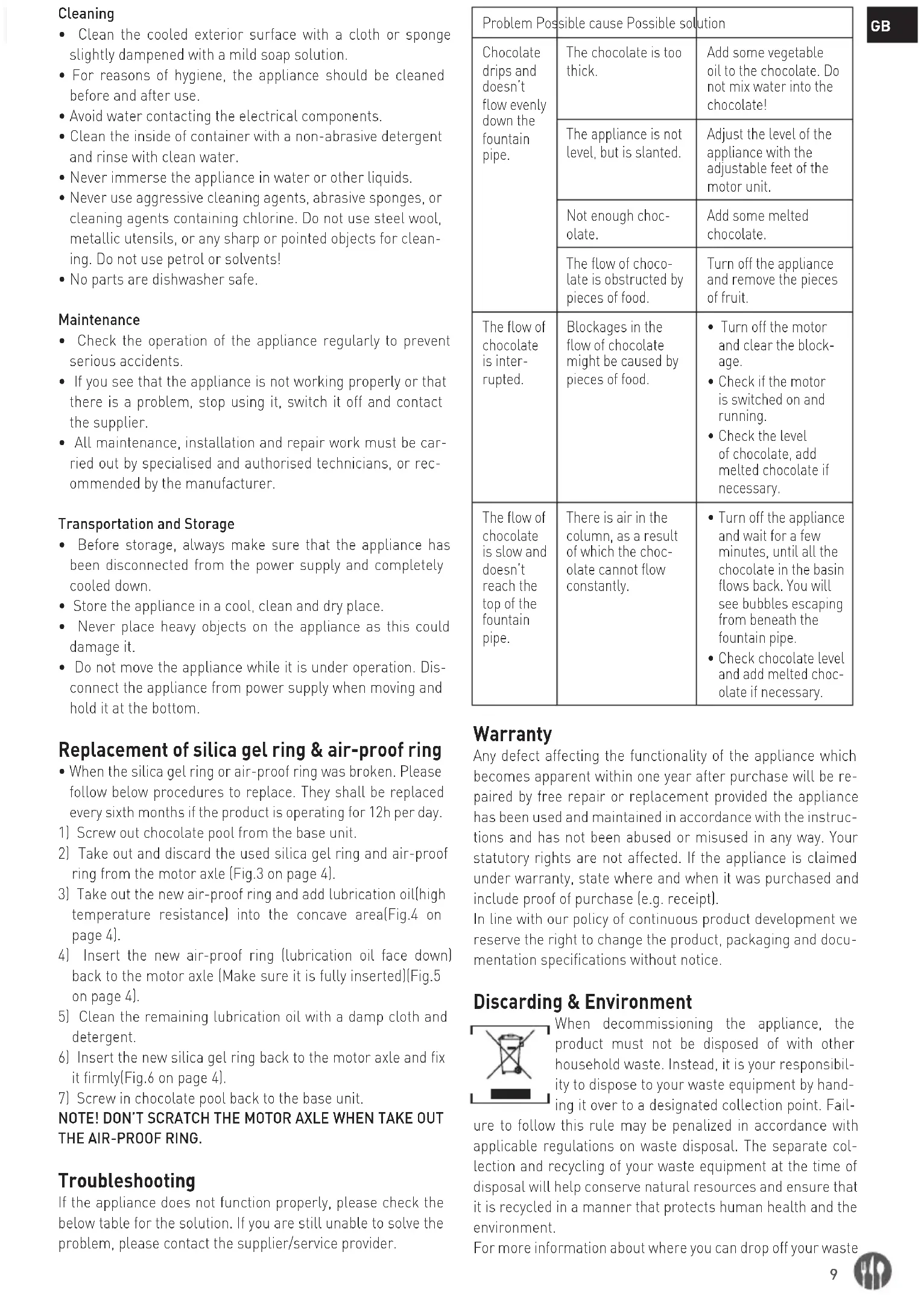 Problem Mögliche Ursache Mögliche Lösung Schokolade tropft und fließt nicht gleichmäßig über die Brunnenlei- tung. Die Schokolade ist zu dick. Geben Sie etwas Pflan- zenöl in die Schokolade. Mischen Sie kein Wasser in die Schokolade! Das Gerät ist nicht waagerecht, sondern schräg. Stellen Sie die Höhe des Geräts mit den verstellba- ren Füßen der Motorein- heit ein. Nicht genug Schokolade. Etwas geschmolzene Schokolade hinzugeben. Der Schokola- denfluss wird durch Lebens- mittel behindert. Schalten Sie das Gerät aus und entfernen Sie die Obststücke. Der Scho- koladen- fluss wird unterbro- chen. Verstopfungen im Schokoladenfluss können durch Lebensmittel ver- ursacht werden.