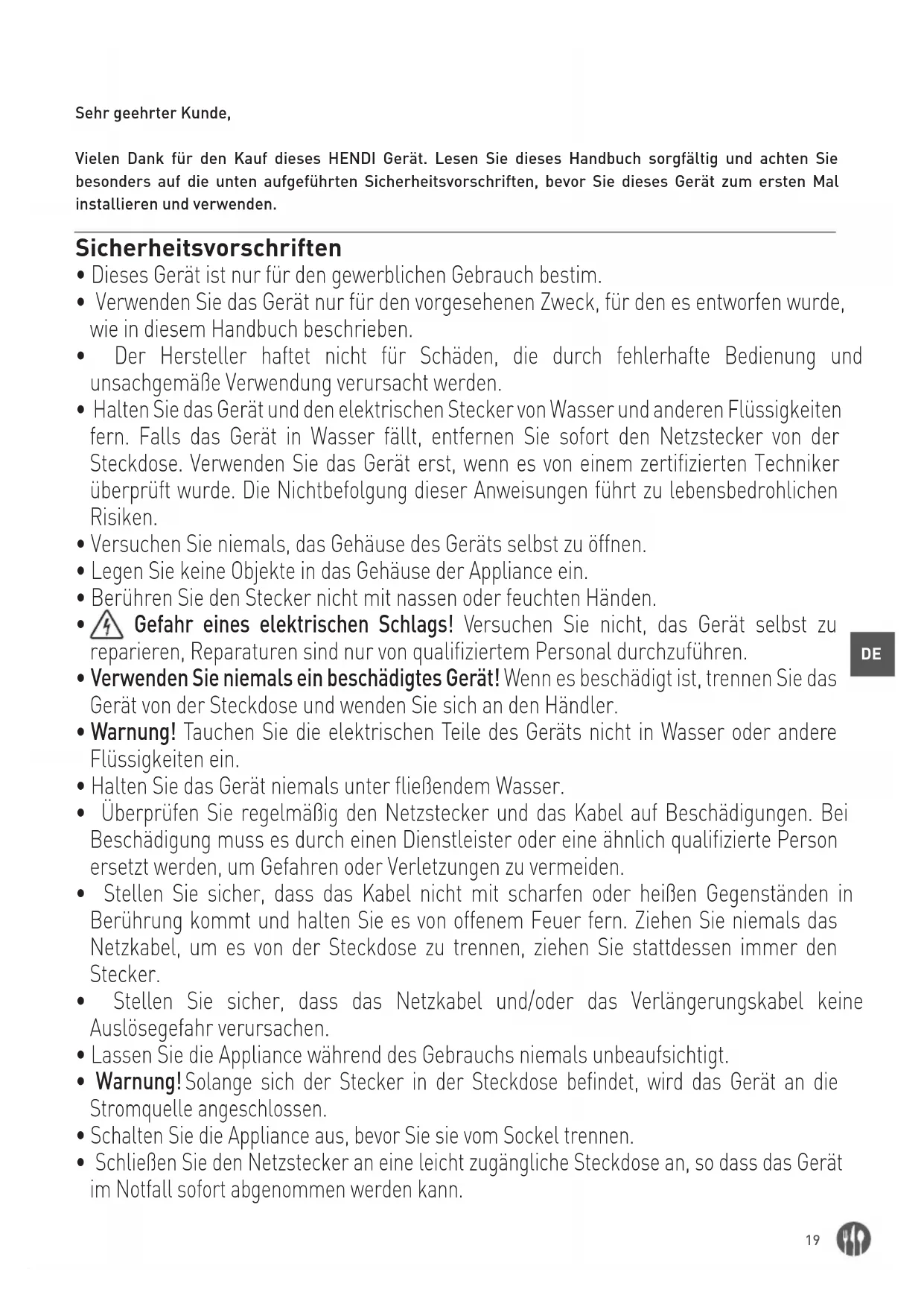 Sehr geehrter Kunde, Vielen Dank für den Kauf dieses HENDI Gerät. Lesen Sie dieses Handbuch sorgfältig und achten Sie besonders auf die unten aufgeführten Sicherheitsvorschriften, bevor Sie dieses Gerät zum ersten Mal installieren und verwenden. Sicherheitsvorschriften