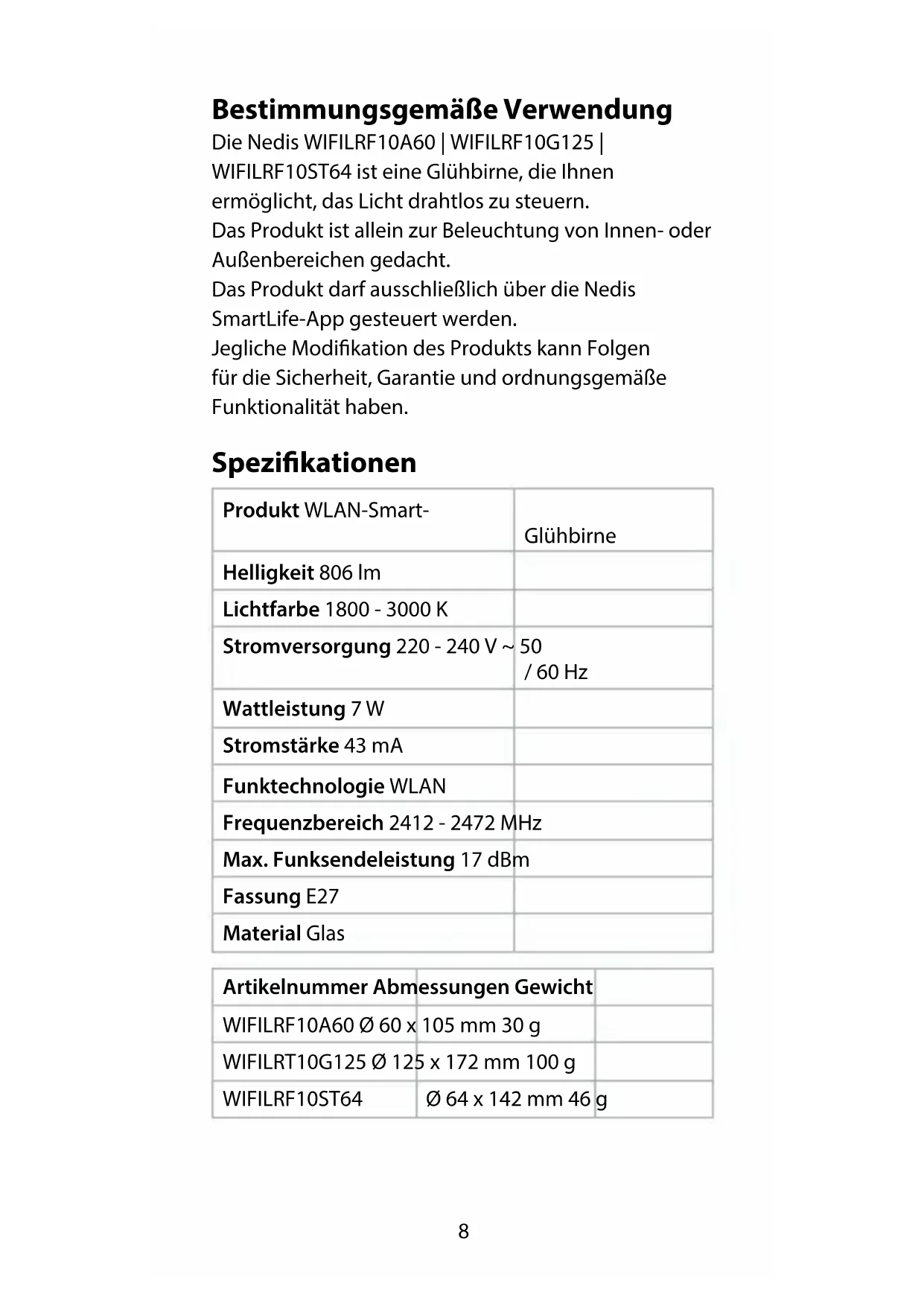 Kurzanleitung WLAN-Smart- Glühbirne WIFILRF10A60 WIFILRF10G125 WIFILRF10ST64 Weitere Informationen nden Sie in der erweiterten Anleitung online: ned.is/wilrf10a60 ned.is/wilrf10g125 ned.is/wilrf10st648 Bestimmungsgemäße Verwendung Die Nedis WIFILRF10A60 | WIFILRF10G125 | WIFILRF10ST64 ist eine Glühbirne, die Ihnen ermöglicht, das Licht drahtlos zu steuern. Das Produkt ist allein zur Beleuchtung von Innen- oder Außenbereichen gedacht. Das Produkt darf ausschließlich über die Nedis SmartLife-App gesteuert werden. Jegliche Modikation des Produkts kann Folgen für die Sicherheit, Garantie und ordnungsgemäße Funktionalität haben. Spezikationen Produkt WLAN-Smart- Glühbirne Helligkeit 806 lm Lichtfarbe 1800 - 3000 K Stromversorgung 220 - 240 V ~ 50 / 60 Hz Wattleistung 7 W Stromstärke 43 mA Funktechnologie WLAN Frequenzbereich 2412 - 2472 MHz Max. Funksendeleistung 17 dBm Fassung E27 Material Glas Artikelnummer Abmessungen Gewicht WIFILRF10A60 Ø 60 x 105 mm 30 g WIFILRT10G125 Ø 125 x 172 mm 100 g WIFILRF10ST64 Ø 64 x 142 mm 46 g9 Hauptbestandteile (Abbildung A) 1 Birne 2 Glühfaden 3 Elektrischer Kontakt Sicherheitshinweise