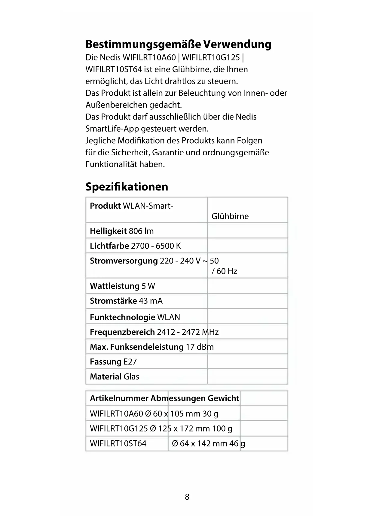 Kurzanleitung WLAN-Smart- Glühbirne WIFILRT10A60 WIFILRT10G125 WIFILRT10ST64 Weitere Informationen nden Sie in der erweiterten Anleitung online: ned.is/wilrt10a60 ned.is/wilrt10g125 ned.is/wilrt10st648 Bestimmungsgemäße Verwendung Die Nedis WIFILRT10A60 | WIFILRT10G125 | WIFILRT10ST64 ist eine Glühbirne, die Ihnen ermöglicht, das Licht drahtlos zu steuern. Das Produkt ist allein zur Beleuchtung von Innen- oder Außenbereichen gedacht. Das Produkt darf ausschließlich über die Nedis SmartLife-App gesteuert werden. Jegliche Modikation des Produkts kann Folgen für die Sicherheit, Garantie und ordnungsgemäße Funktionalität haben. Spezikationen Produkt WLAN-Smart- Glühbirne Helligkeit 806 lm Lichtfarbe 2700 - 6500 K Stromversorgung 220 - 240 V ~ 50 / 60 Hz Wattleistung 5 W Stromstärke 43 mA Funktechnologie WLAN Frequenzbereich 2412 - 2472 MHz Max. Funksendeleistung 17 dBm Fassung E27 Material Glas Artikelnummer Abmessungen Gewicht WIFILRT10A60 Ø 60 x 105 mm 30 g WIFILRT10G125 Ø 125 x 172 mm 100 g WIFILRT10ST64 Ø 64 x 142 mm 46 g9 Hauptbestandteile (Abbildung A) 1 Birne 2 Glühfaden 3 Elektrischer Kontakt Sicherheitshinweise