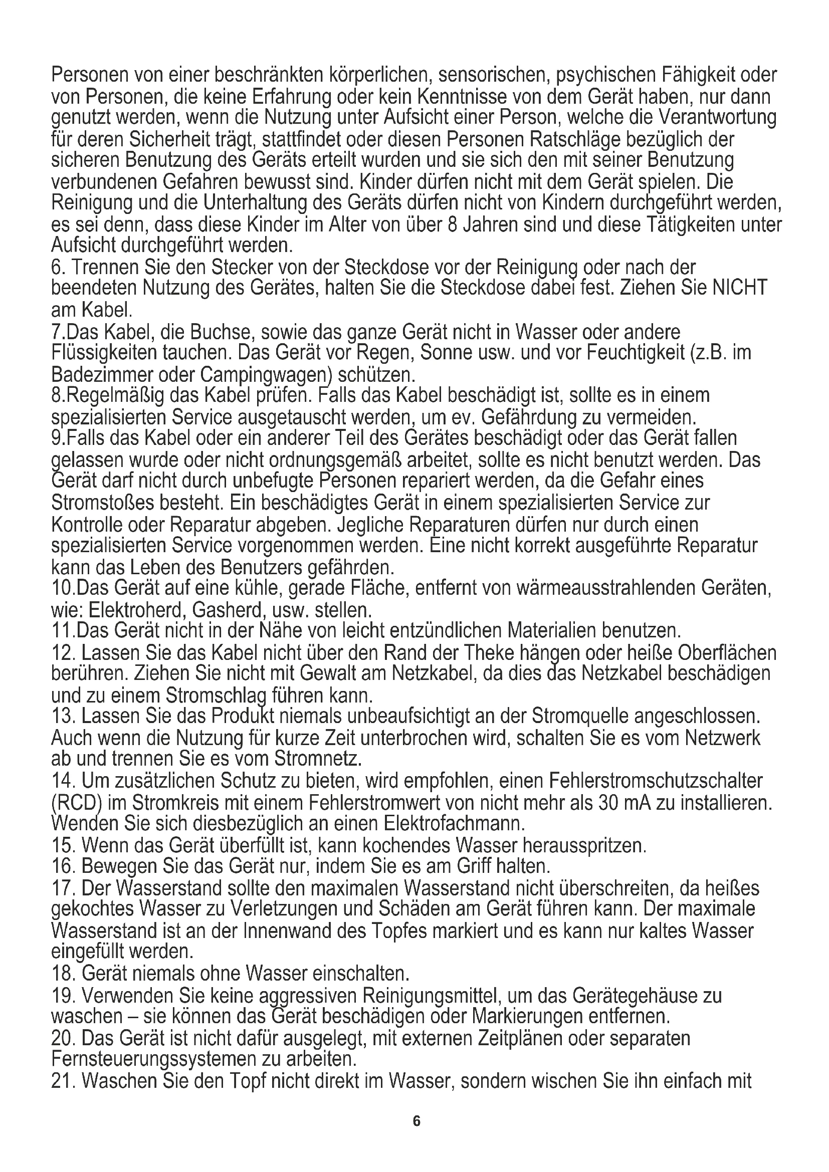TECHNICAL DATA: Capacity for water boiling: 1,0L Total volume: 1,9L Voltage: 220-240V ~50-60Hz Power: 780-900W6 Personen von einer beschränkten körperlichen, sensorischen, psychischen Fähigkeit oder von Personen, die keine Erfahrung oder kein Kenntnisse von dem Gerät haben, nur dann genutzt werden, wenn die Nutzung unter Aufsicht einer Person, welche die Verantwortung für deren Sicherheit trägt, stattfindet oder diesen Personen Ratschläge bezüglich der sicheren Benutzung des Geräts erteilt wurden und sie sich den mit seiner Benutzung verbundenen Gefahren bewusst sind. Kinder dürfen nicht mit dem Gerät spielen. Die Reinigung und die Unterhaltung des Geräts dürfen nicht von Kindern durchgeführt werden, es sei denn, dass diese Kinder im Alter von über 8 Jahren sind und diese Tätigkeiten unter Aufsicht durchgeführt werden.