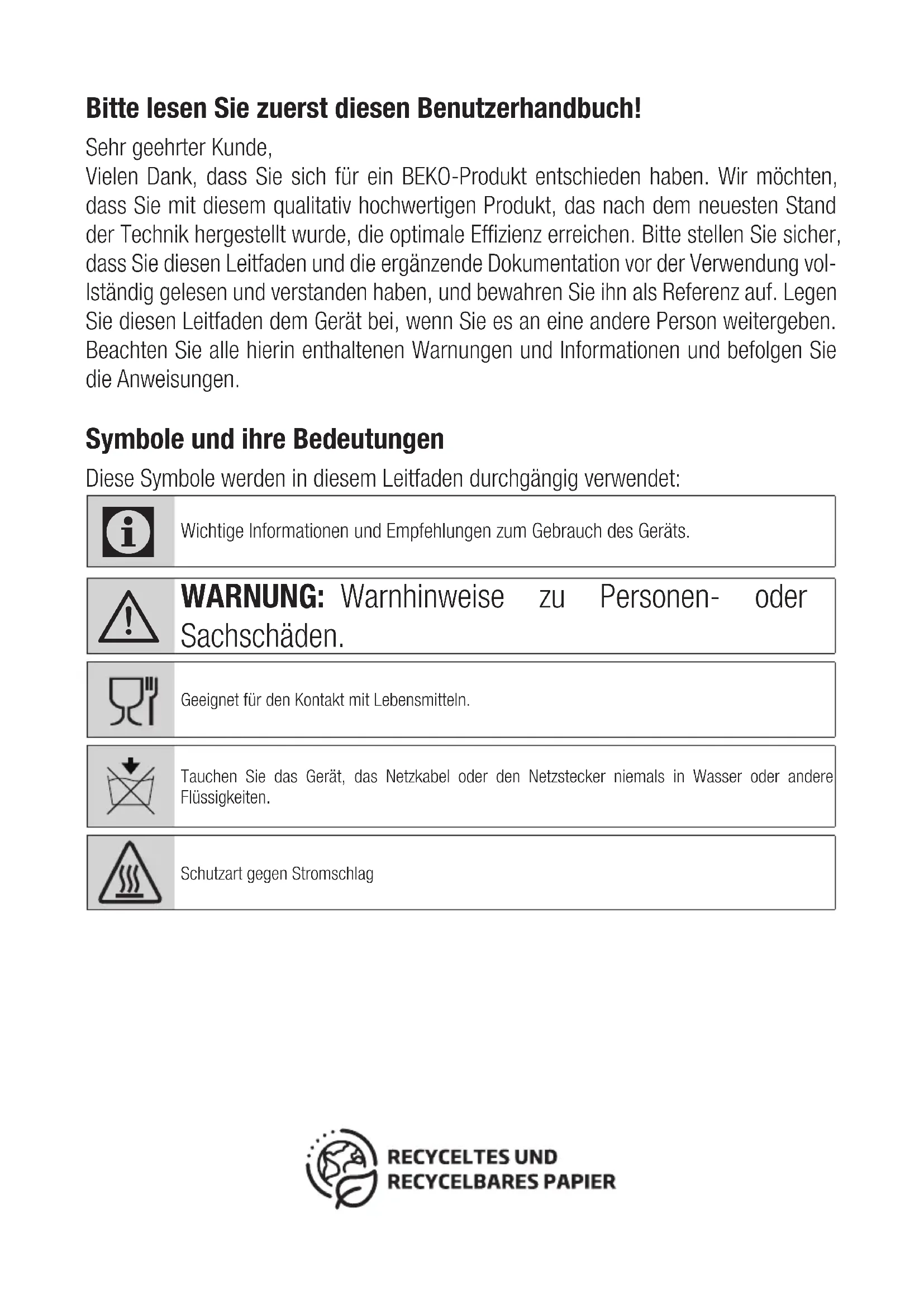 Unidentifiable scent Foreign object on cooking basket, basket drawer and heater Clean foreign object Contact our authorised service for repair, in case the problem cannot be solved after performing the above- mentioned supervision.Bitte lesen Sie zuerst diesen Benutzerhandbuch! Sehr geehrter Kunde, Vielen Dank, dass Sie sich für ein BEKO-Produkt entschieden haben. Wir möchten, dass Sie mit diesem qualitativ hochwertigen Produkt, das nach dem neuesten Stand der Technik hergestellt wurde, die optimale Effizienz erreichen. Bitte stellen Sie sicher, dass Sie diesen Leitfaden und die ergänzende Dokumentation vor der Verwendung vol- lständig gelesen und verstanden haben, und bewahren Sie ihn als Referenz auf. Legen Sie diesen Leitfaden dem Gerät bei, wenn Sie es an eine andere Person weitergeben. Beachten Sie alle hierin enthaltenen Warnungen und Informationen und befolgen Sie die Anweisungen. Symbole und ihre Bedeutungen Diese Symbole werden in diesem Leitfaden durchgängig verwendet: