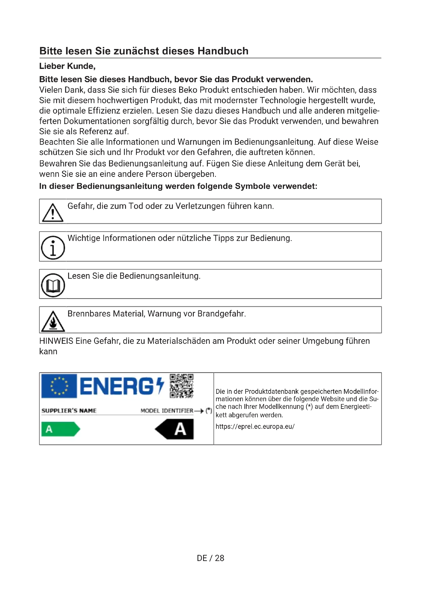 FRDE / 28 Bitte lesen Sie zunächst dieses Handbuch Lieber Kunde, Bitte lesen Sie dieses Handbuch, bevor Sie das Produkt verwenden. Vielen Dank, dass Sie sich für dieses Beko Produkt entschieden haben. Wir möchten, dass Sie mit diesem hochwertigen Produkt, das mit modernster Technologie hergestellt wurde, die optimale Effizienz erzielen. Lesen Sie dazu dieses Handbuch und alle anderen mitgelie- ferten Dokumentationen sorgfältig durch, bevor Sie das Produkt verwenden, und bewahren Sie sie als Referenz auf. Beachten Sie alle Informationen und Warnungen im Bedienungsanleitung. Auf diese Weise schützen Sie sich und Ihr Produkt vor den Gefahren, die auftreten können. Bewahren Sie das Bedienungsanleitung auf. Fügen Sie diese Anleitung dem Gerät bei, wenn Sie sie an eine andere Person übergeben. In dieser Bedienungsanleitung werden folgende Symbole verwendet: Gefahr, die zum Tod oder zu Verletzungen führen kann. Wichtige Informationen oder nützliche Tipps zur Bedienung. Lesen Sie die Bedienungsanleitung. Brennbares Material, Warnung vor Brandgefahr. HINWEIS Eine Gefahr, die zu Materialschäden am Produkt oder seiner Umgebung führen kann Die in der Produktdatenbank gespeicherten Modellinfor- mationen können über die folgende Website und die Su- che nach Ihrer Modellkennung (*) auf dem Energieeti- kett abgerufen werden. https://eprel.ec.europa.eu/DE / 29 1 Sicherheitshinweise ..................... 30