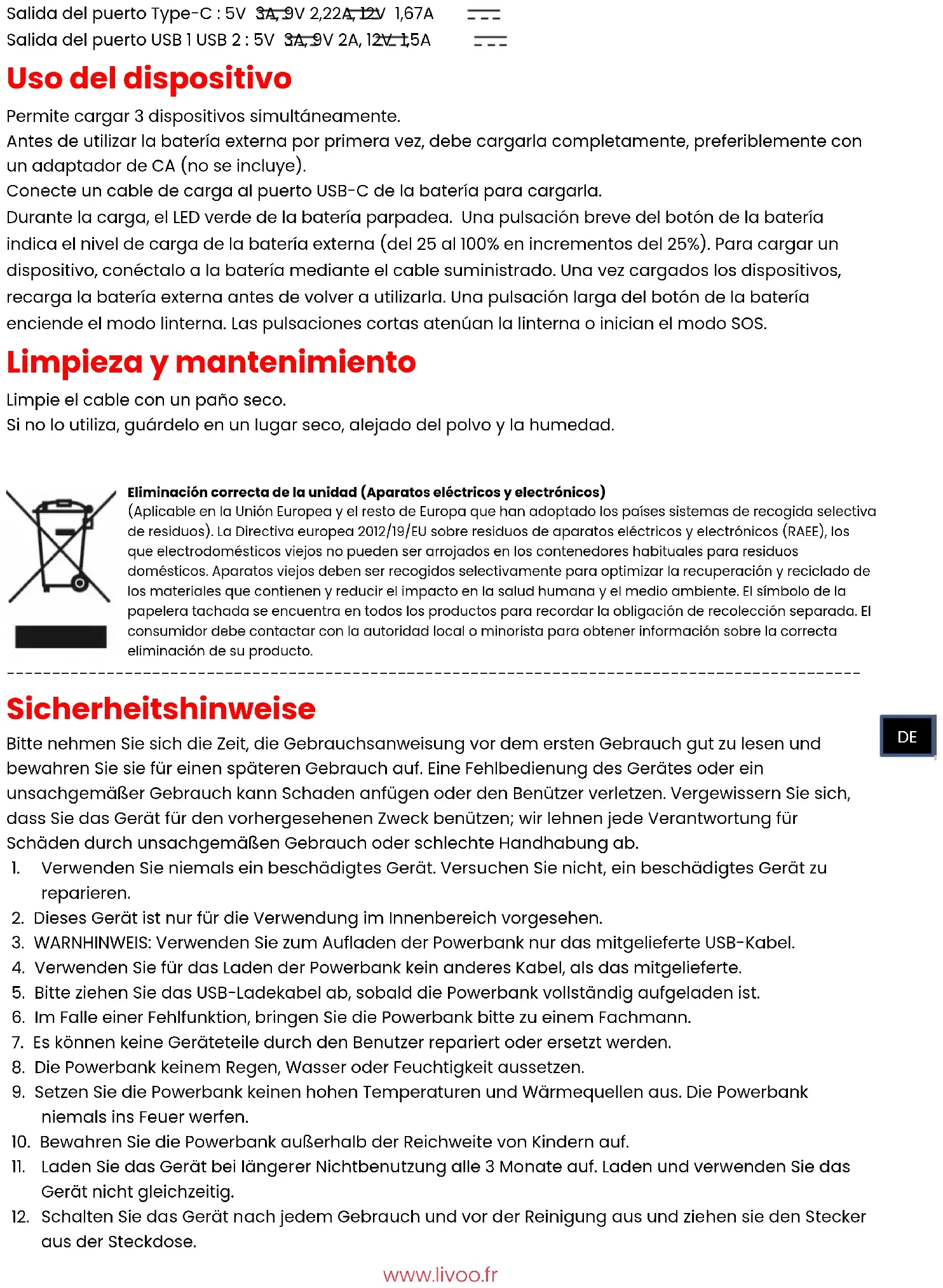 auf dem Gerät entspricht. Technische Spezifikationen Akkukapazität: 3,7V 20 000mAh Max. Ladeleistung: 20 W Eingang per Type-C-Kabel : 5V 3A, 9V 2A Micro-USB-Eingang : 5V 2A, 9V 2A Ausgang Typ-C-Anschluss : 5V 3A, 9V 2,22A, 12V 1,67A USB 1-Port-Ausgang USB 2 : 5V 3A, 9V 2A, 12V 1,5A Verwendung des Gerätes Ermöglicht das Aufladen von 3 Geräten gleichzeitig Vor der Erstverwendung der Powerbank, müssen Sie ihn vollständig aufladen, am besten mit einem AC- Netzadapter (nicht im Lieferumfang enthalten). Stecken Sie ein Ladekabel in den USB-C-Anschluss des Akkus, um ihn aufzuladen. Während des Ladevorgangs blinkt eine grüne LED auf dem Akku. Ein kurzes Drücken der Akkutaste zeigt den Ladestand des externen Akkus an (von 25 bis 100 % in 25 %-Schritten). Um ein Gerät aufzuladen, verbinden Sie Ihr Gerät und den Akku mithilfe des mitgelieferten Kabels. Wenn Sie Ihre Geräte aufgeladen haben, laden Sie den externen Akku auf, bevor Sie ihn wieder verwenden. Ein langer Druck auf die Akkutaste schaltet den Taschenlampenmodus ein. Durch kurzes Drücken wird die Lichtintensität der Taschenlampe gedimmt oder der SOS-Modus gestartet. Reinigung und Wartung Wischen Sie das Kabel mit einem trockenen Tuch ab. Korrekte Entsorgung des Geräts (Electrical and Electronic Equipment) (Gültig in der Europäischen Union und dem Rest Europas, dass die Länder einem separaten Sammelsystem eingeführt haben). Die europäische Richtlinie 2012/19/EU über Elektro-und Elektronik-Altgeräte (WEEE), in Verbindung bleiben Das alte elektrische Haushaltsgeräte dürfen nicht über den normalen Hausmüll entsorgt werden. Altgeräte müssen separat gesammelt werden, um die Wiederverwertung und das Recycling der beinhalteten Materialien zu optimieren und die Auswirkungen auf die menschliche Gesundheit und die Umwelt. Das Symbol der durchgestrichenen Mülltonne auf alle Produkte gekennzeichnet, die aus der getrennten Sammlung zu erinnern. Die Verbraucher sollten ihre Kontaktdaten lokalen Behörden oder Ihren Händler für Informationen über die korrekte Entsorgung ihrer Produkte.