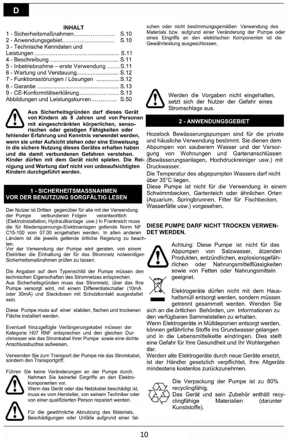 DET WERDEN. Achtung: Diese Pumpe ist nicht für das Abpumpen von Salzwasser, ätzenden Produkten, entzündlichen, explosionsgefäh- rlichen oder Nahrungsmittelflüssigkeiten sowie von Fetten oder Nahrungsmitteln geeignet. Elektrogeräte dürfen nicht mit dem Haus- haltsmüll entsorgt werden, sondern müssen getrennt gesammelt werden. Wenden Sie sich an die örtlichen Behörden, um Informationen zu den verfügbaren Sammelstellen zu erhalten. Wenn Elektrogeräte in Mülldeponien entsorgt werden, können gefährliche Stoffe ins Grundwasser gelangen und in die Lebensmittelkette eindringen. Dies stellt eine Gefahr für Ihre Gesundheit und Ihr Wohlergehen dar. Werden alte Elektrogeräte durch neue Geräte ersetzt, ist der Händler gesetzlich verpflichtet, Ihre Altgeräte mindestens kostenlos zurückzunehmen. Die Verpackung der Pumpe ist zu 80% recyclingfähig. Das Gerät und sein Zubehör enthält recy- clingfähige Materialien (darunter Kunststoffe).11