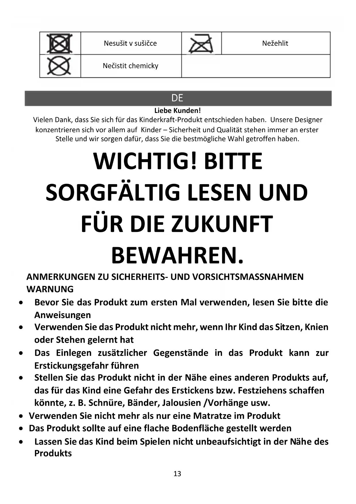 - Lassen Sie das Kind beim Spielen nicht unbeaufsichtigt in der Nähe des Produkts14