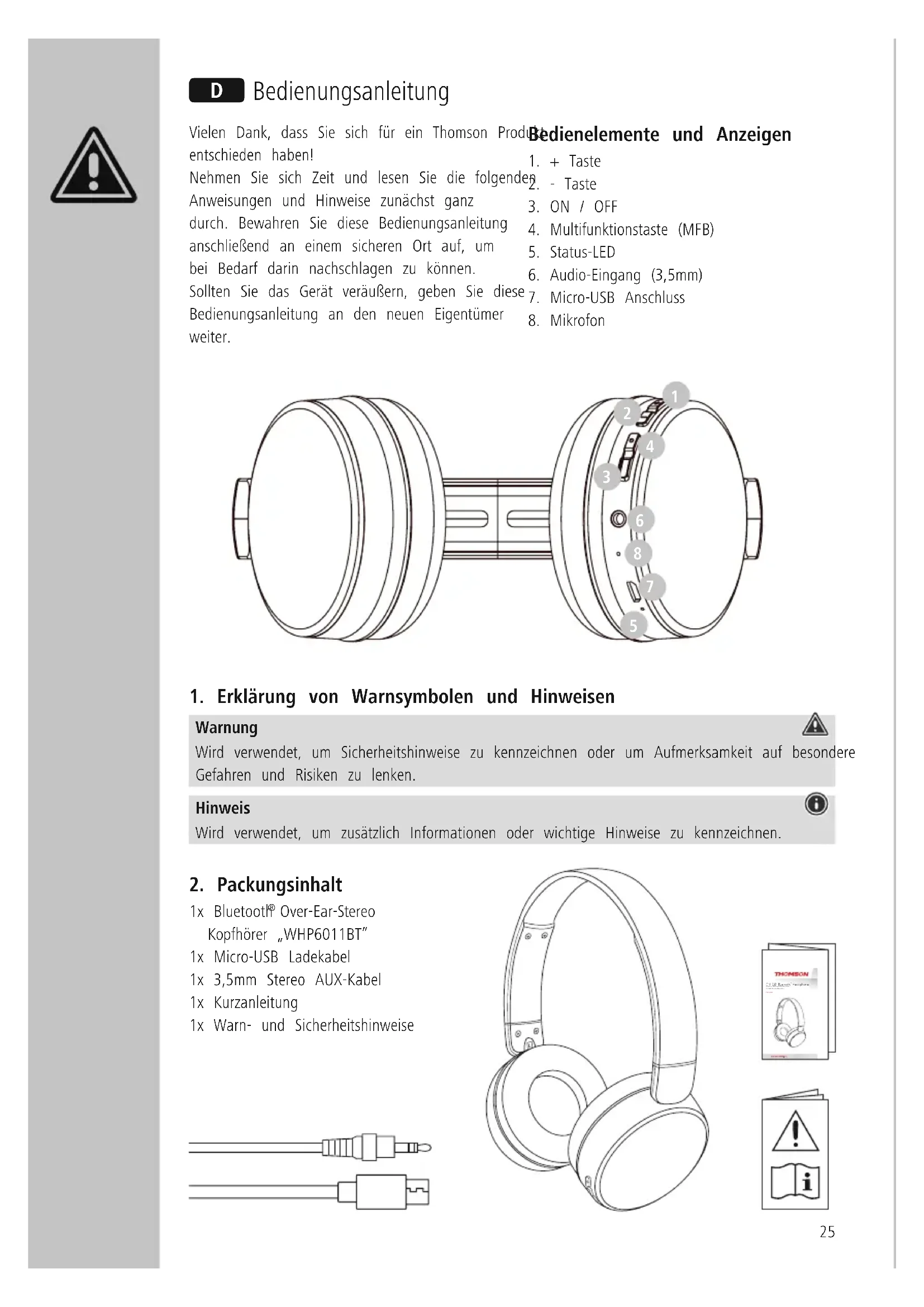 Over-Ear-Stereo Kopfhörer „WHP6011BT” 1x Micro-USB Ladekabel 1x 3,5mm Stereo AUX-Kabel 1x Kurzanleitung 1x Warn- und Sicherheitshinweise