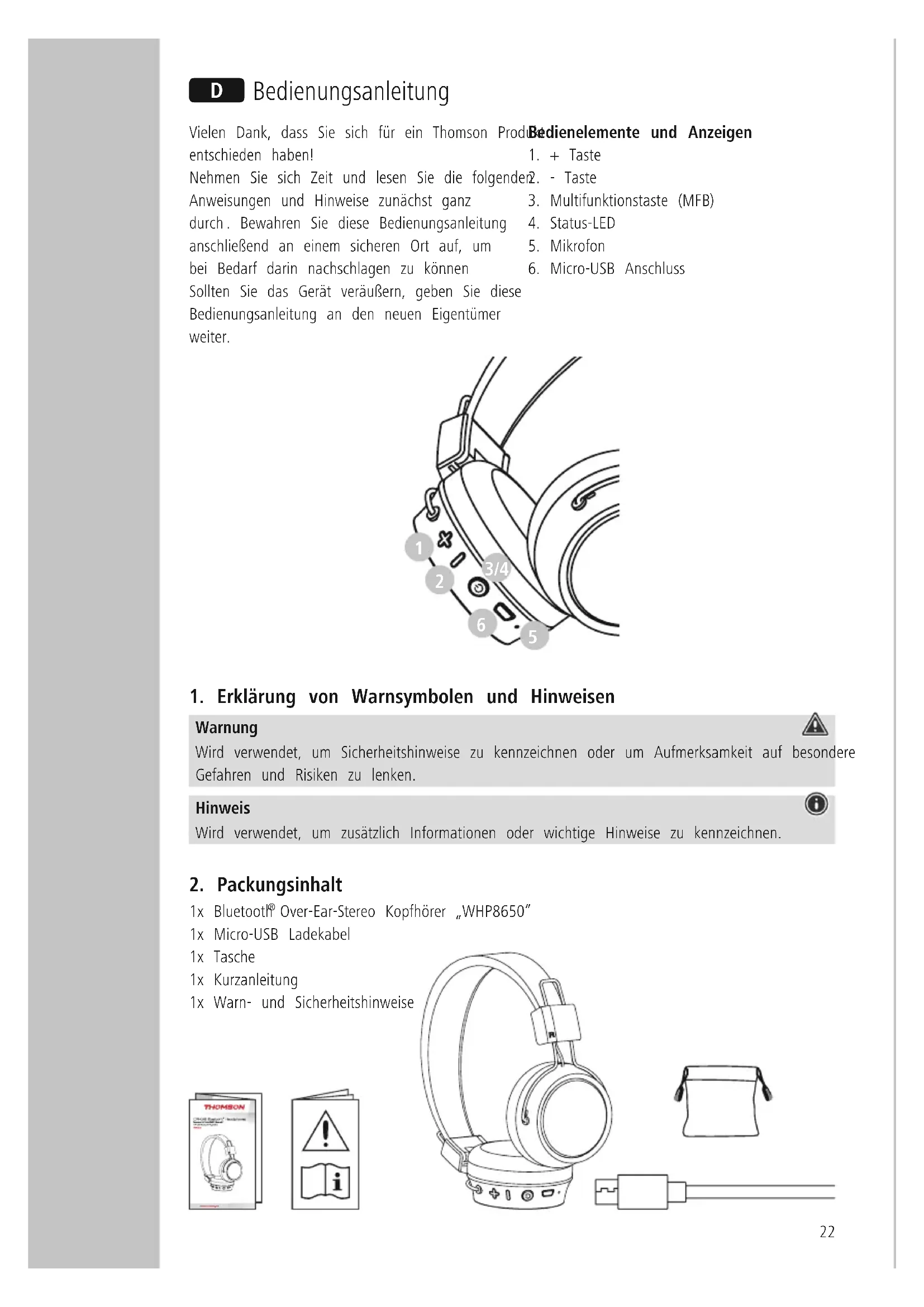 Over-Ear-Stereo Kopfhörer „WHP8650” 1x Micro-USB Ladekabel 1x Tasche 1x Kurzanleitung 1x Warn- und Sicherheitshinweise D Bedienungsanleitung