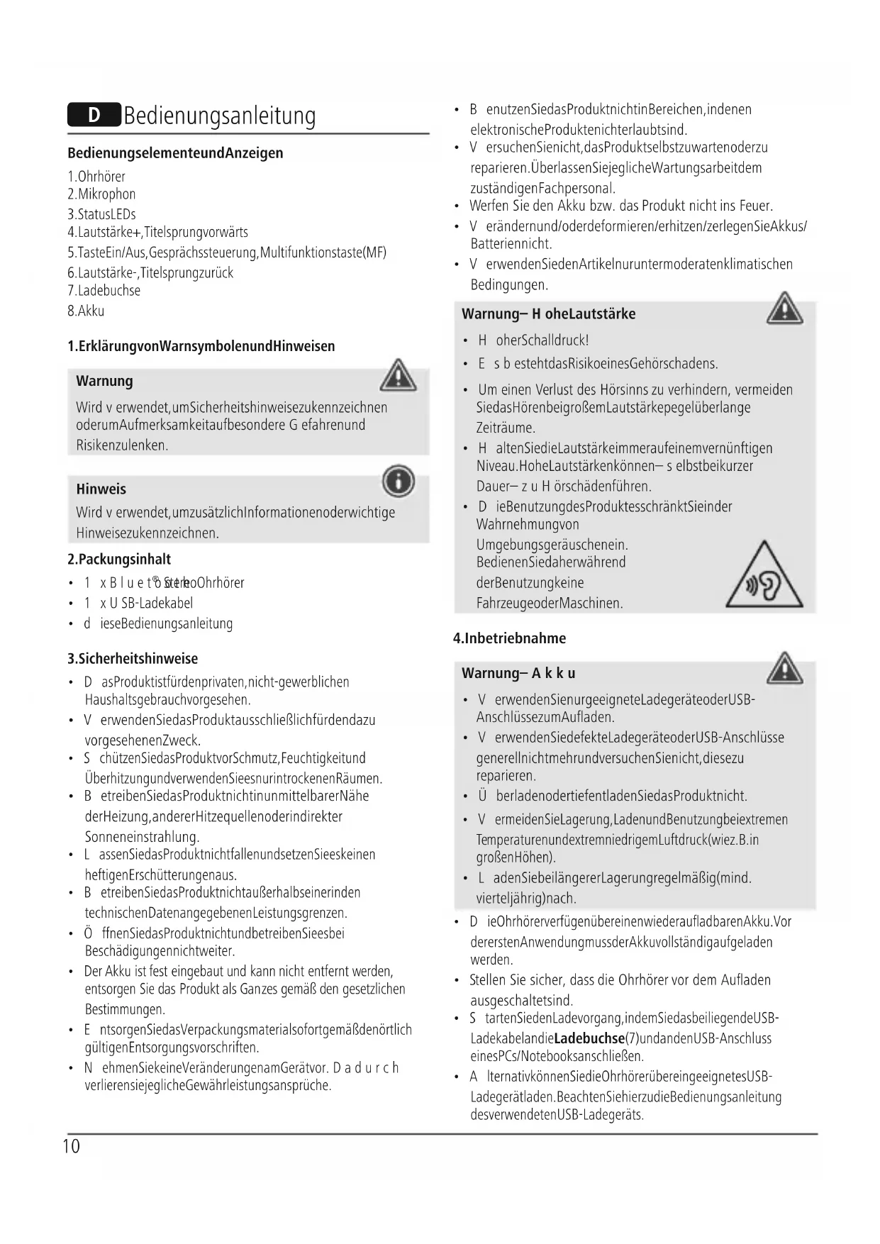 - Die Benutzung des Produktes schränkt Sie in der Wahrnehmung von Umgebungsgeräuschen ein. Bedienen Sie daher während der Benutzung keine Fahrzeuge oder Maschinen.