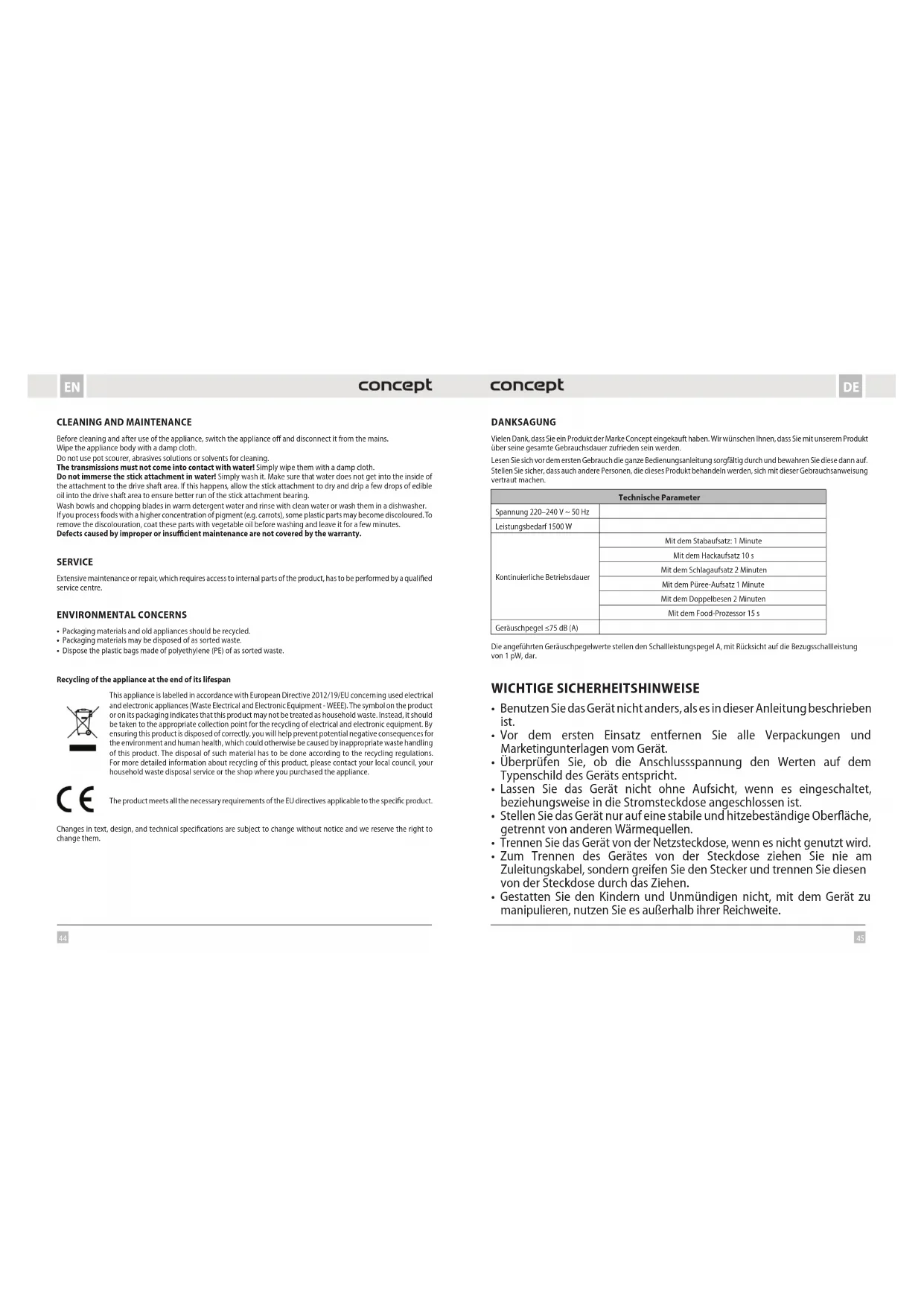 - Dispose the plastic bags made of polyethylene (PE) of as sorted waste. Recycling of the appliance at the end of its lifespan This appliance is labelled in accordance with European Directive 2012/19/EU concerning used electrical and electronic appliances (Waste Electrical and Electronic Equipment - WEEE). The symbol on the product or on its packaging indicates that this product may not be treated as household waste. Instead, it should be taken to the appropriate collection point for the recycling of electrical and electronic equipment. By ensuring this product is disposed of correctly, you will help prevent potential negative consequences for the environment and human health, which could otherwise be caused by inappropriate waste handling of this product. The disposal of such material has to be done according to the recycling regulations. For more detailed information about recycling of this product, please contact your local council, your household waste disposal service or the shop where you purchased the appliance. The product meets all the necessary requirements of the EU directives applicable to the specific product. Changes in text, design, and technical specifications are subject to change without notice and we reserve the right to change them. DANKSAGUNG Vielen Dank, dass Sie ein Produkt der Marke Concept eingekauft haben. Wir wünschen Ihnen, dass Sie mit unserem Produkt über seine gesamte Gebrauchsdauer zufrieden sein werden. Lesen Sie sich vor dem ersten Gebrauch die ganze Bedienungsanleitung sorgfältig durch und bewahren Sie diese dann auf. Stellen Sie sicher, dass auch andere Personen, die dieses Produkt behandeln werden, sich mit dieser Gebrauchsanweisung vertraut machen. Technische Parameter Spannung 220–240 V ~ 50 Hz Leistungsbedarf 1500 W Kontinuierliche Betriebsdauer Mit dem Stabaufsatz: 1 Minute Mit dem Hackaufsatz 10 s Mit dem Schlagaufsatz 2 Minuten Mit dem Püree-Aufsatz 1 Minute Mit dem Doppelbesen 2 Minuten Mit dem Food-Prozessor 15 s Geräuschpegel ≤75 dB (A) Die angeführten Geräuschpegelwerte stellen den Schallleistungspegel A, mit Rücksicht auf die Bezugsschallleistung von 1 pW, dar. WICHTIGE SICHERHEITSHINWEISE