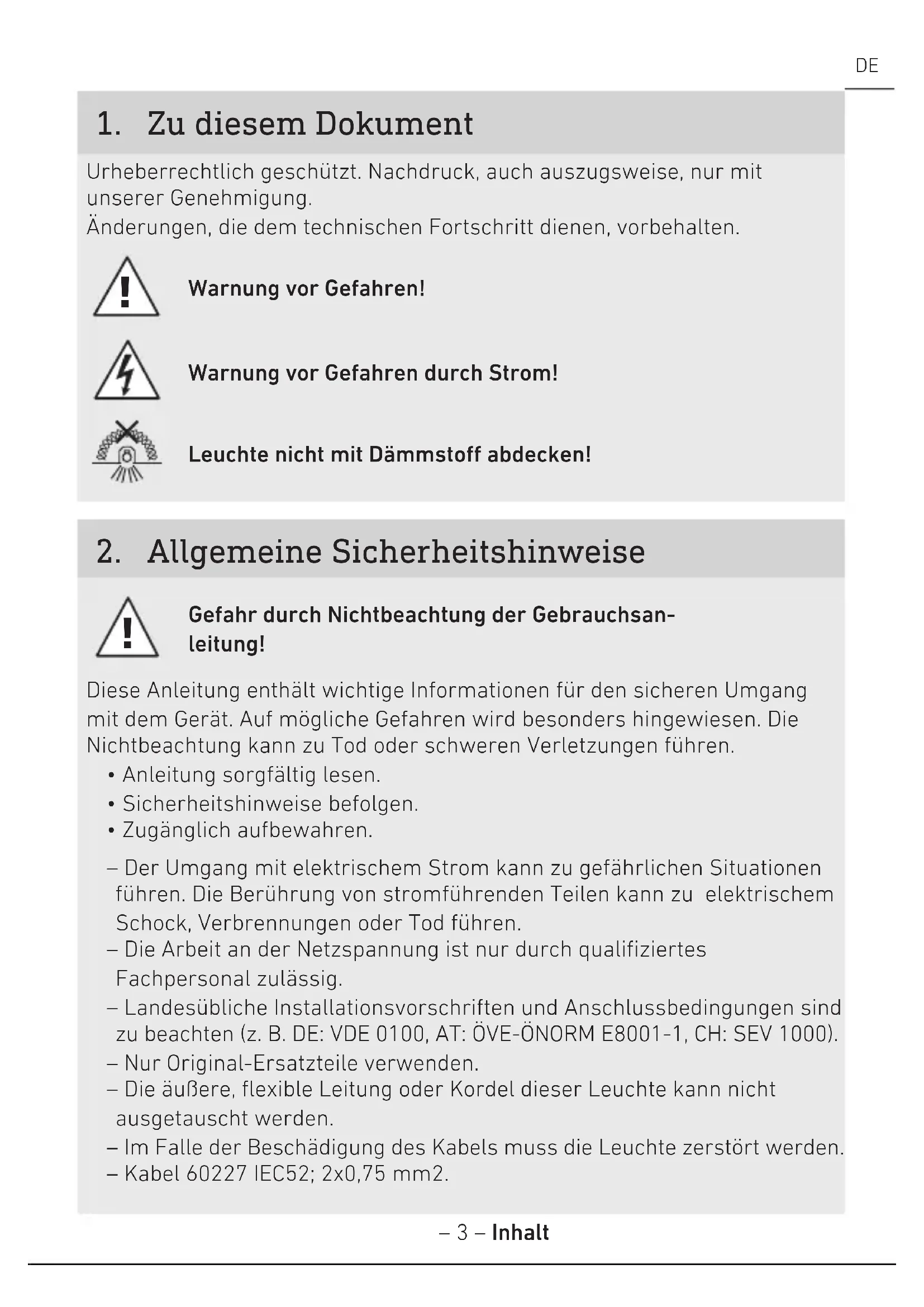 - Zugänglich aufbewahren. – Der Umgang mit elektrischem Strom kann zu gefährlichen Situationen führen. Die Berührung von stromführenden Teilen kann zu elektrischem Schock, Verbrennungen oder Tod führen. – Die Arbeit an der Netzspannung ist nur durch qualifiziertes Fachpersonal zulässig. – Landesübliche Installationsvorschriften und Anschlussbedingungen sind zu beachten (z.B. DE: VDE0100, AT:ÖVE-ÖNORM E8001-1, CH:SEV1000). – Nur Original-Ersatzteile verwenden. – Die äußere, flexible Leitung oder Kordel dieser Leuchte kann nicht ausgetauscht werden. – Im Falle der Beschädigung des Kabels muss die Leuchte zerstört werden. – Kabel 60227 IEC52; 2x0,75 mm2.– 4 – Inhalt