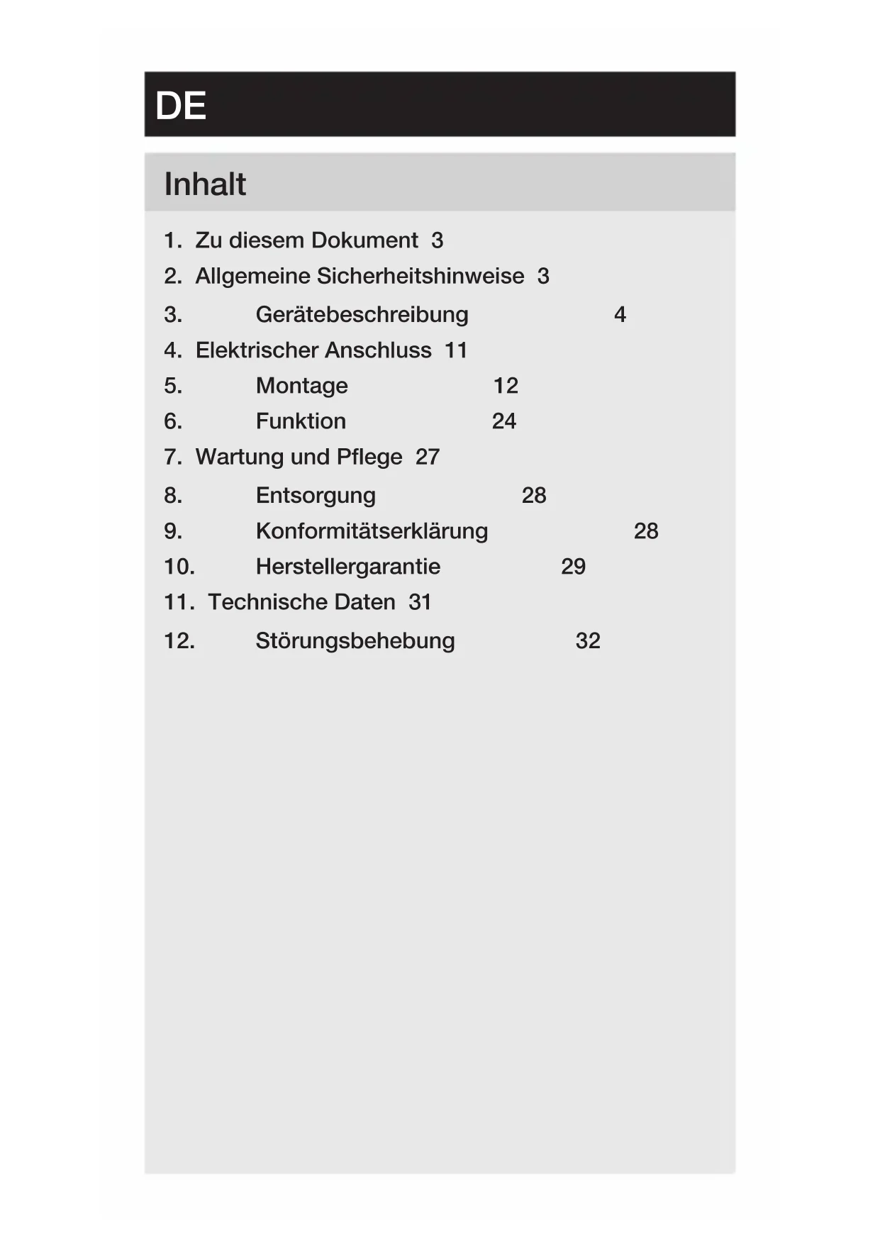 - Zugänglich aufbewahren. – Der Umgang mit elektrischem Strom kann zu gefährlichen Situationen führen. Die Berührung von strom führenden Teilen kann zu elektrischem Schock, Verbrennungen oder Tod führen. – Die Arbeit an der Netzspannung ist nur durch qualifizier- tes Fachpersonal zulässig. – Landesübliche Installationsvorschriften und Anschluss- bedingungen sind zu beachten (z.B. D: VDE 0100, A: ÖVE-ÖNORM E8001-1, CH:SEV 1000).– 4 – Inhalt – Nur Original-Ersatzteile verwenden. – Reparaturen sind nur durch Fachbetriebe zulässig.