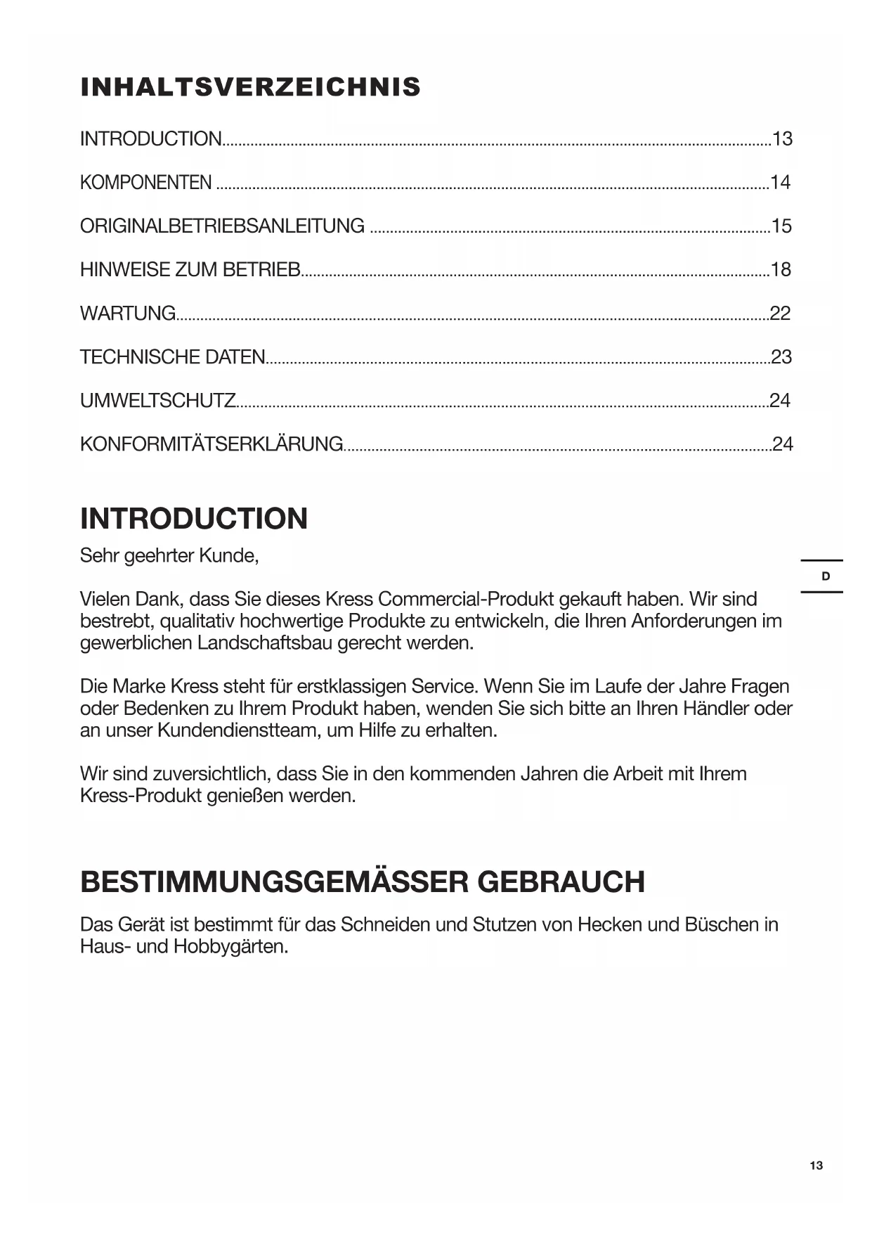 - KONFORMITÄTSERKLÄRUNG INTRODUCTION Sehr geehrter Kunde, Vielen Dank, dass Sie dieses Kress Commercial-Produkt gekauft haben. Wir sind bestrebt, qualitativ hochwertige Produkte zu entwickeln, die Ihren Anforderungen im gewerblichen Landschaftsbau gerecht werden. Die Marke Kress steht für erstklassigen Service. Wenn Sie im Laufe der Jahre Fragen oder Bedenken zu Ihrem Produkt haben, wenden Sie sich bitte an Ihren Händler oder an unser Kundendienstteam, um Hilfe zu erhalten. Wir sind zuversichtlich, dass Sie in den kommenden Jahren die Arbeit mit Ihrem Kress-Produkt genießen werden. p. 24
