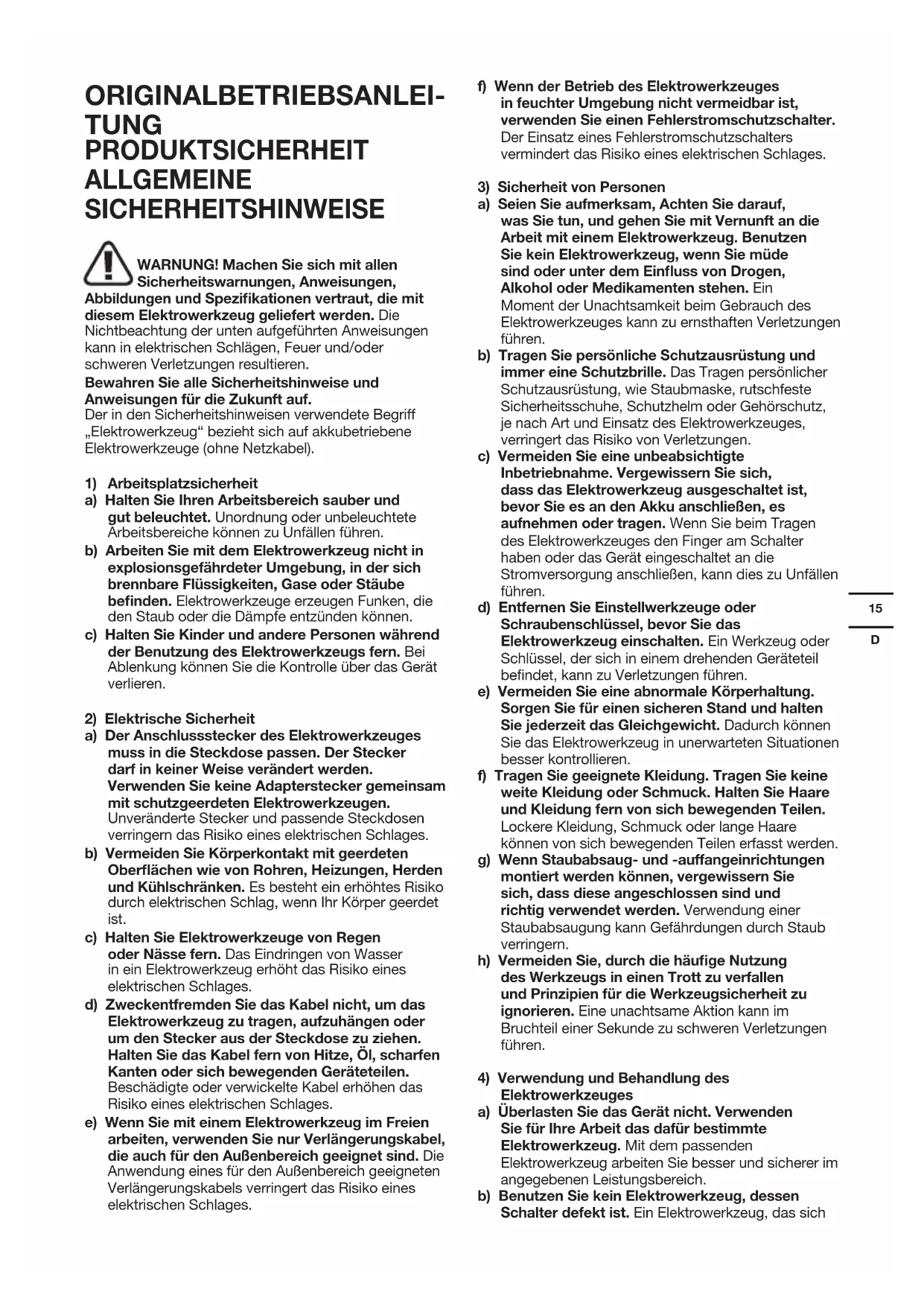 ORIGINALBETRIEBSANLEI- TUNG PRODUKTSICHERHEIT ALLGEMEINE SICHERHEITSHINWEISE WARNUNG! Machen Sie sich mit allen Sicherheitswarnungen, Anweisungen, Abbildungen und Spezifikationen vertraut, die mit diesem Elektrowerkzeug geliefert werden. Die Nichtbeachtung der unten aufgeführten Anweisungen kann in elektrischen Schlägen, Feuer und/oder schweren Verletzungen resultieren. Bewahren Sie alle Sicherheitshinweise und Anweisungen für die Zukunft auf. Der in den Sicherheitshinweisen verwendete Begriff „Elektrowerkzeug“ bezieht sich auf akkubetriebene Elektrowerkzeuge (ohne Netzkabel).