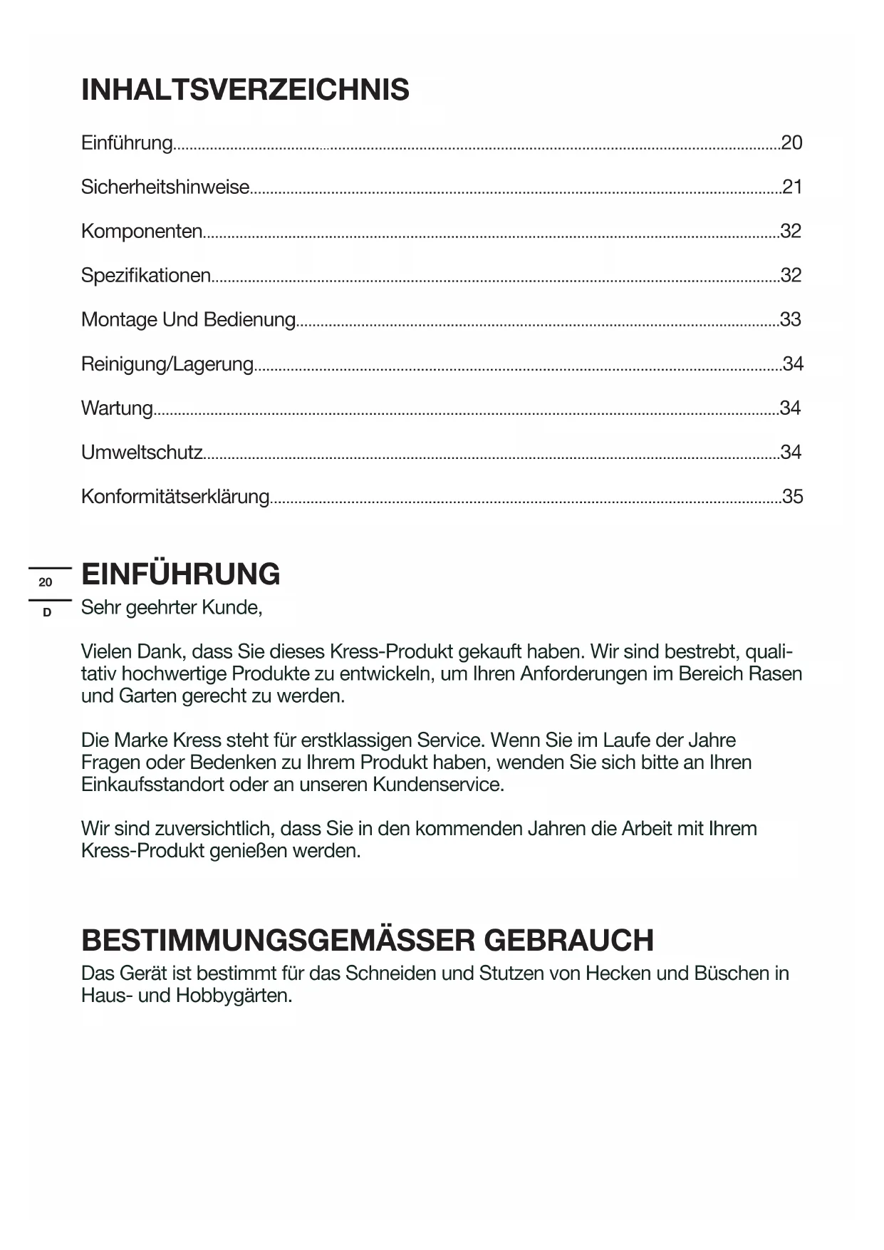 - Konformitätserklärung EINFÜHRUNG Sehr geehrter Kunde, Vielen Dank, dass Sie dieses Kress-Produkt gekauft haben. Wir sind bestrebt, quali- tativ hochwertige Produkte zu entwickeln, um Ihren Anforderungen im Bereich Rasen und Garten gerecht zu werden. Die Marke Kress steht für erstklassigen Service. Wenn Sie im Laufe der Jahre Fragen oder Bedenken zu Ihrem Produkt haben, wenden Sie sich bitte an Ihren Einkaufsstandort oder an unseren Kundenservice. Wir sind zuversichtlich, dass Sie in den kommenden Jahren die Arbeit mit Ihrem Kress-Produkt genießen werden. p. 35