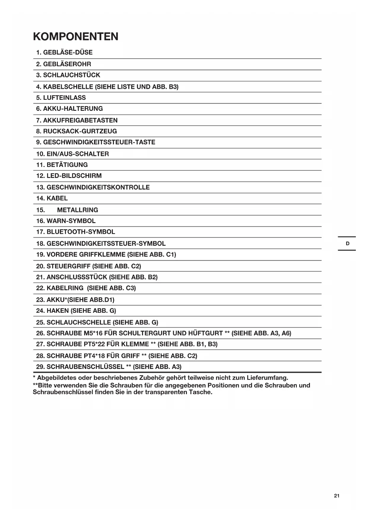 - Abgebildetes oder beschriebenes Zubehör gehört teilweise nicht zum Lieferumfang. **Bitte verwenden Sie die Schrauben für die angegebenen Positionen und die Schrauben und Schraubenschlüssel finden Sie in der transparenten Tasche.22