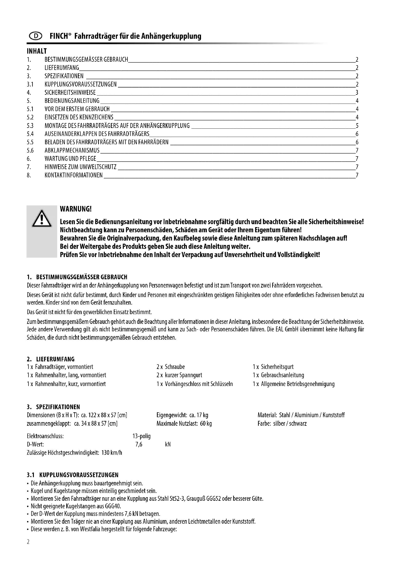 - Art.-Nr.: 11584 FINCH® Fahrradträger für die Anhängerkupplung Bedienungsanleitung p. 2