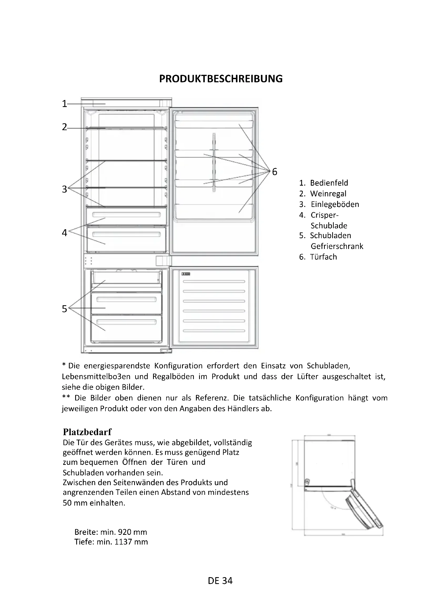 - Die energiesparendste Konfiguration erfordert den Einsatz von Schubladen, Lebensmittelbo3en und Regalböden im Produkt und dass der Lüfter ausgeschaltet ist, siehe die obigen Bilder. ** Die Bilder oben dienen nur als Referenz. Die tatsächliche Konfiguration hängt vom jeweiligen Produkt oder von den Angaben des Händlers ab. Platzbedarf Die Tür des Gerätes muss, wie abgebildet, vollständig geöffnet werden können. Es muss genügend Platz zum bequemen Öffnen der Türen und Schubladen vorhanden sein. Zwischen den Seitenwänden des Produkts und angrenzenden Teilen einen Abstand von mindestens 50 mm einhalten. Breite: min. 920 mm Tiefe: min. 1137 mm