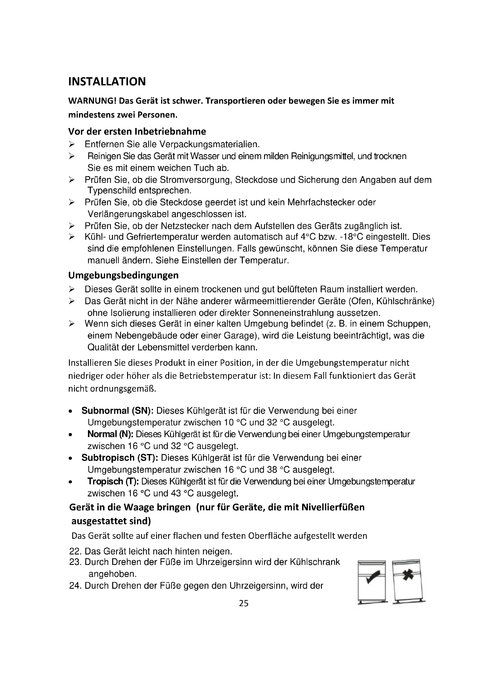 23. Durch Drehen der Füße im Uhrzeigersinn wird der Kühlschrank