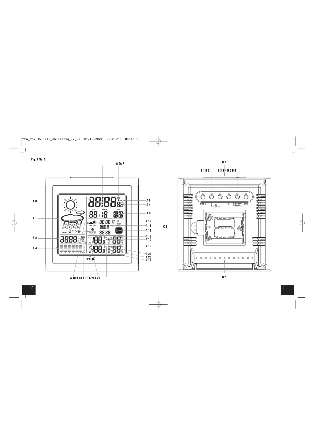 A: Display-Anzeige (Fig. 1): A 1: Wettervorhersage mit Symbolen und Trendanzeige A 2: Absoluter oder relativer Luftdruck mit Vergangenheitswerten (12 Std.) A 3: Grafische Darstellung der letzten 12 Std. A 4: Uhrzeit mit Sekunden A 5: DCF Empfangssignal A 6: DST Symbol A 7: Alarmsymbol A 8: Snoozesymbol A 9: Datum und Wochentag A 10: Sonnenauf- und -untergangszeit A 11: Standort A 12: Tidenindikator A 13: Mondphase A 14: Temperatur und Luftfeuchtigkeit innen A 15: Komfortstufe des Raumklimas A 16: Temperatur und Luftfeuchtigkeit außen A 17: Maximum- und Minimum-Anzeige A 18: Batteriesymbol für das Basisgerät A 19: Batteriesymbol für den Sender A 20: Tendenzanzeigen A 21: Kanalnummer mit Empfangszeichen A 22: Temperaturalarm A 23: Frostalarm B: Tasten (Fig. 2+3): B 1: MODE Taste B 2: + Taste B 3: – Taste B 4: CH Taste B 5: HISTORY ABS/REL Taste B 6: CITY Taste B 7: SNOOZE/LIGHT Taste TFA_No. 35.1145_Anleitung_12_20 09.12.2020 9:12 Uhr Seite 498 LARGO – Funk-Wetterstation