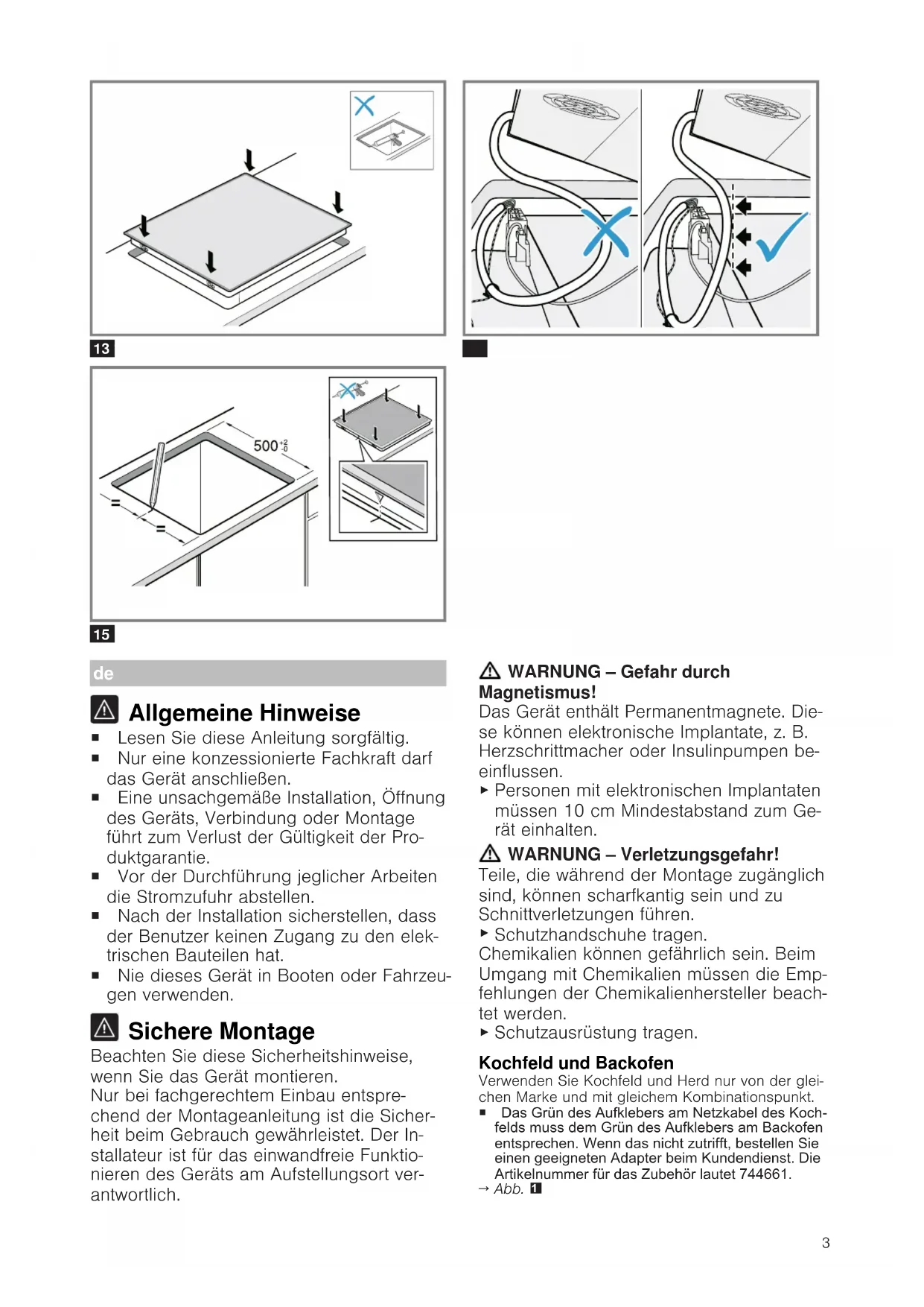 Personen mit elektronischen Implantaten müssen 10cm Mindestabstand zum Ge- rät einhalten. WARNUNG‒Verletzungsgefahr! Teile, die während der Montage zugänglich sind, können scharfkantig sein und zu Schnittverletzungen führen.