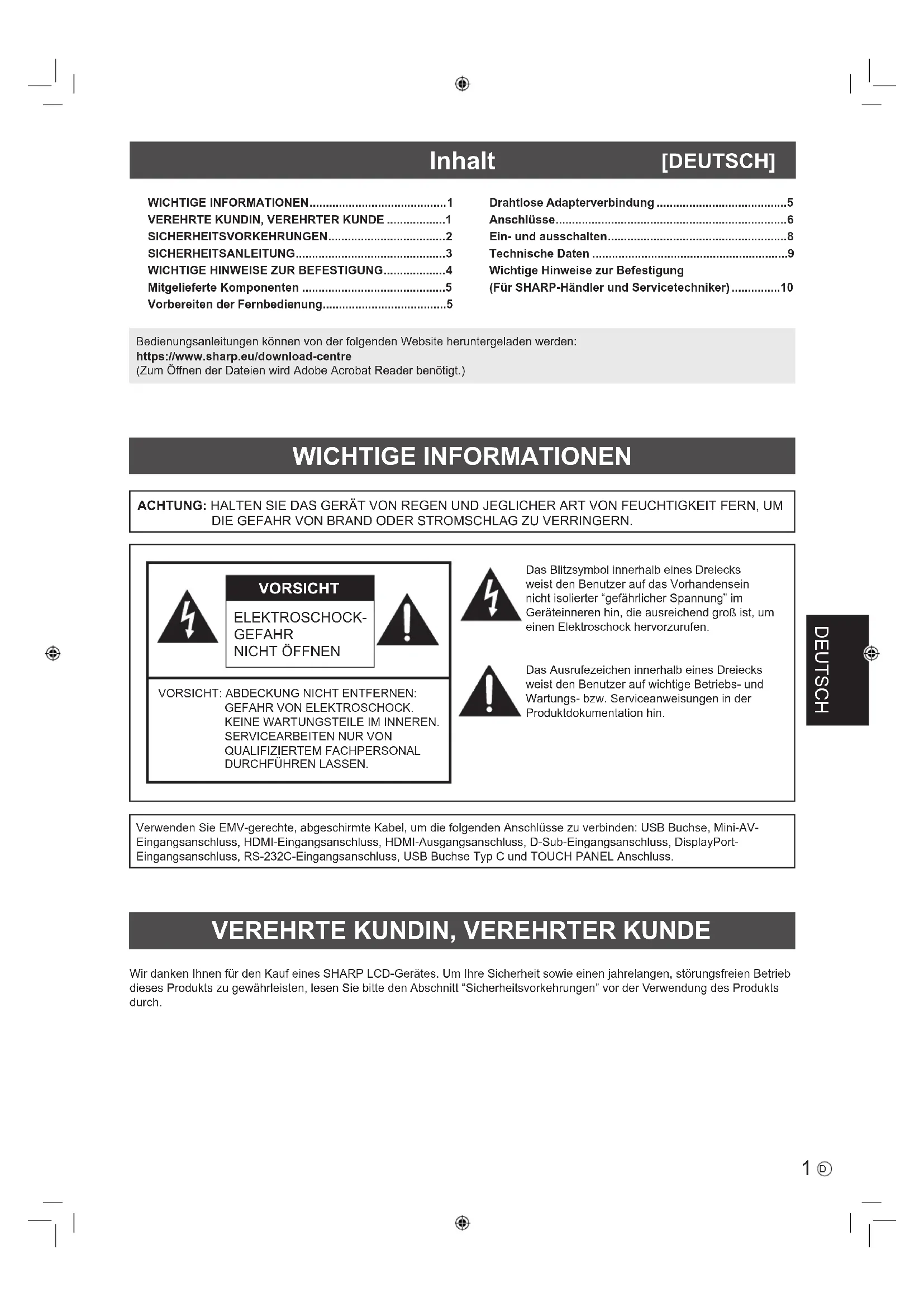 - DEUTSCH ACHTUNG: HALTEN SIE DAS GERÄT VON REGEN UND JEGLICHER ART VON FEUCHTIGKEIT FERN, UM DIE GEFAHR VON BRAND ODER STROMSCHLAG ZU VERRINGERN.VORSICHT: ABDECKUNG NICHT ENTFERNEN: GEFAHR VON ELEKTROSCHOCK. KEINE WARTUNGSTEILE IM INNEREN. SERVICEARBEITEN NUR VON QUALIFIZIERTEM FACHPERSONAL DURCHFÜHREN LASSEN.Das Blitzsymbol innerhalb eines Dreiecks weist den Benutzer auf das Vorhandensein nicht isolierter “gefährlicher Spannung” im Geräteinneren hin, die ausreichend groß ist, um einen Elektroschock hervorzurufen.Das Ausrufezeichen innerhalb eines Dreiecks weist den Benutzer auf wichtige Betriebs- und Wartungs- bzw. Serviceanweisungen in der Produktdokumentation hin. Inhalt [DEUTSCH] WICHTIGE INFORMATIONEN VEREHRTEKUNDIN,VEREHRTERKUNDE Wir danken Ihnen für den Kauf eines SHARP LCD-Gerätes. Um Ihre Sicherheit sowie einen jahrelangen, störungsfreien Betrieb dieses Produkts zu gewährleisten, lesen Sie bitte den Abschnitt “Sicherheitsvorkehrungen” vor der Verwendung des Produkts durch.WICHTIGE INFORMATIONEN p. 1