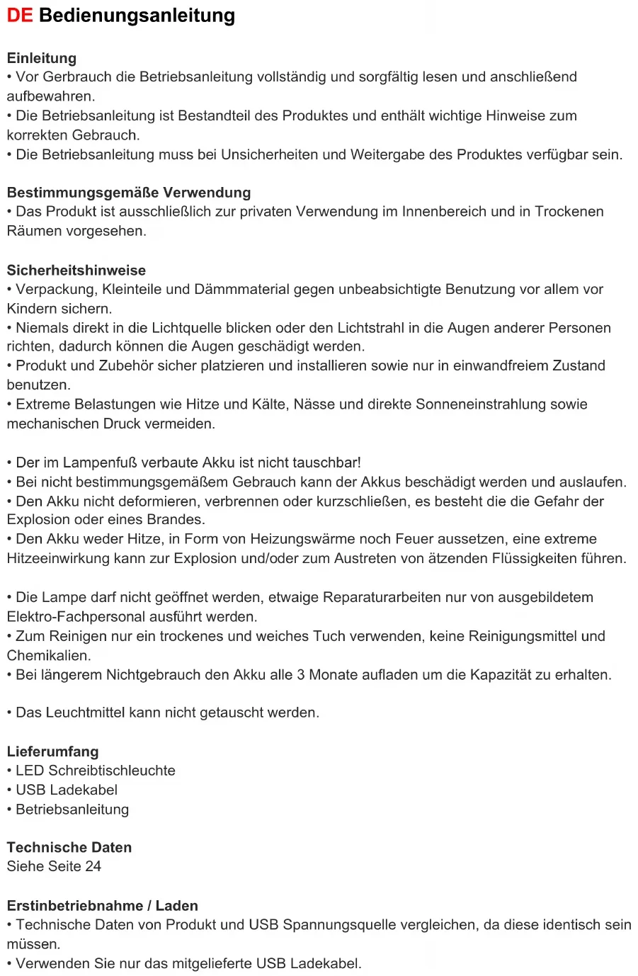 - Der im Lampenfuß verbaute Akku ist nicht tauschbar!