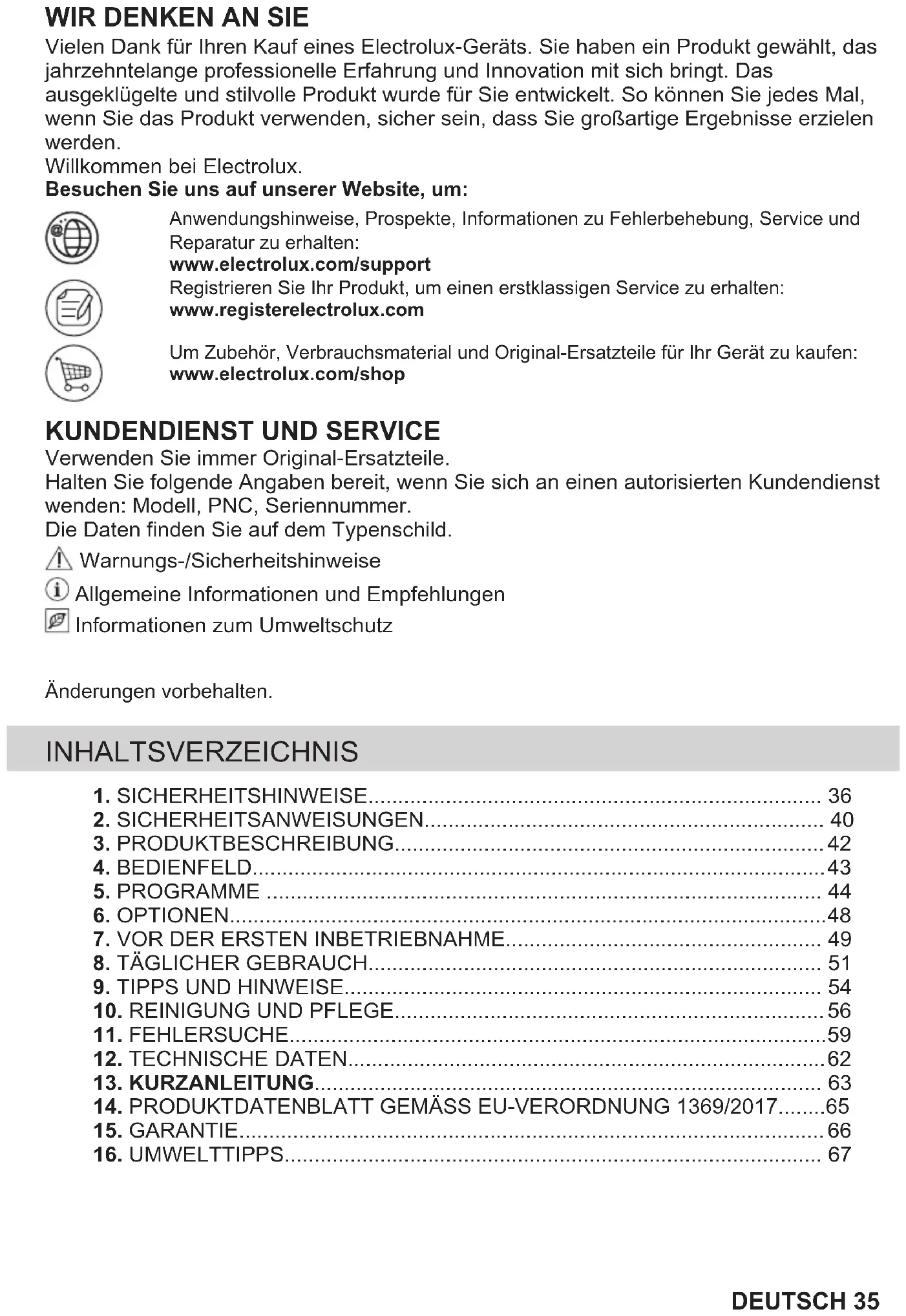 Vielen Dank für Ihren Kauf eines Electrolux-Geräts. Sie haben ein Produkt gewählt, das jahrzehntelange professionelle Erfahrung und Innovation mit sich bringt. Das ausgeklügelte und stilvolle Produkt wurde für Sie entwickelt. So können Sie jedes Mal, wenn Sie das Produkt verwenden, sicher sein, dass Sie großartige Ergebnisse erzielen werden. Willkommen bei Electrolux. Besuchen Sie uns auf unserer Website, um: Anwendungshinweise, Prospekte, Informationen zu Fehlerbehebung, Service undReparatur zu erhalten:www.electrolux.com/supportRegistrieren Sie Ihr Produkt, um einen erstklassigen Service zu erhalten:www.registerelectrolux.comUm Zubehör, Verbrauchsmaterial und Original-Ersatzteile für Ihr Gerät zu kaufen:www.electrolux.com/shop
