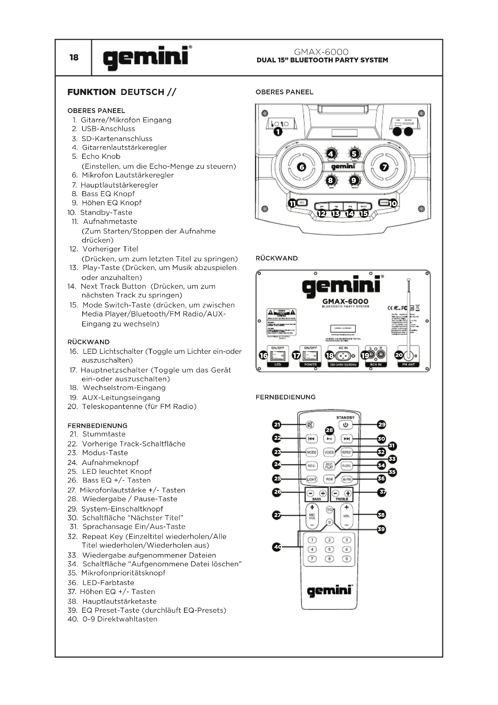 DEUTSCH // BESCHREIBUNG Das Gemini GMAX-6000 Dual 15” Bluetooth Party System ist alles, was Sie brauchen, um die ultimative Nachtclub-Erfahrung in jedem Raum oder Event zu erleben! Dieses Tower-System ist der größte und lauteste Bluetooth-Lautsprecher, den Sie je gesehen haben. Mit 6000 Watt Leistung lässt der GMAX-6000 seine Doppel 15” Woofer und Doppel 6” Hochtöner bei jeder Lautstärke erstaunlich klingen. Das DJ- Style-Interface macht das Steuern Ihrer Musik einfach und intuitiv und die eingebauten Lichter sorgen für Party-Atmosphäre. Mit Eingängen für Mikrofon und Gitarre, Karaoke und sogar voller Live-Performance ist so einfach wie das Drehen eines Knopfes. Egal, ob Sie Ihren Lieblingssong hören oder die Menge auf Ihrer nächsten Poolparty unterhalten, die GMAX-6000 macht Sie zur Hauptattraktion. SCHALTPLAN