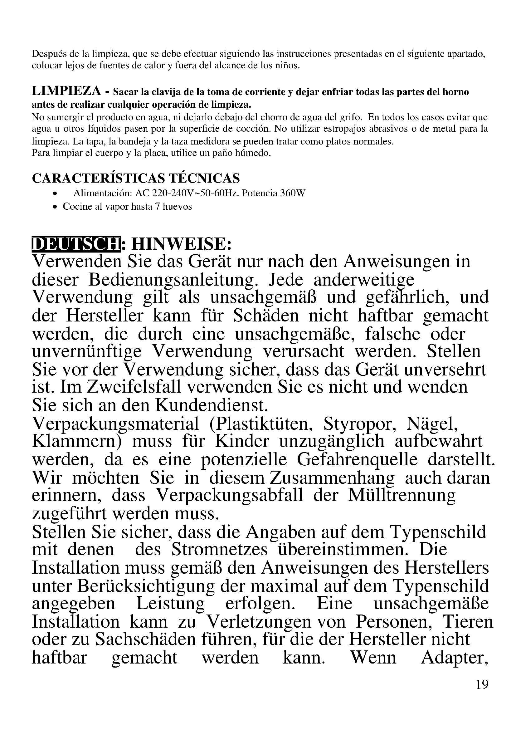Dieses Funktion ist zum Kochen von Eiern in der Schale geeignet. - Das Gerät auf einer ebenen, stabilen und hitzefesten Fläche aufstellen. - Lassen Sie das Wasser mit dem Messbecher auf die Heizplatte (3) ab. - Da das Gerät automatisch stoppt wenn das Wasser ausgeht, kann die eingegossene Wassermenge die Garzeit bestimmen (siehe Tabelle unten). - Setzen Sie das Fach (2) in Position und legen Sie die Eier darauf. Mit dem Deckel (1) abdecken. - Stecken Sie den Stecker in die Steckdose und drehen Sie den Zündknopf (5) auf Position „2“. - In der Tabelle sind die indikativen Garzeiten und die Mindestmenge an Wasser aufgeführt, die hinzugefügt werden muss. Bedenken Sie, dass 70 ml Wasser in etwa 10-11 Minuten ausgehen. Garart / Eierhärte Kochzeit (Minuten) Wassermenge (ML) Weich 7-9 50-60 Mittleres Kochen 10-12 70-80 Gekochtes Ei 15-18 100-120 Die Daten in der Tabelle sind als Richtwerte zu betrachten. Die Garzeiten und die in dieser Zeit verbrauchte Wassermenge können Umgebungstemperatur, Anzahl der Eier, Wassertemperatur usw. variieren. Es empfiehlt sich, die Kochzeit und/oder die Wassermenge mit Erfahrung anzupassen. - Wenn das Wasser aufgebraucht ist, stoppt der Kochvorgang und die Betriebsanzeige erlischt; Drehen Sie den Knopf (5) auf Position "0", warten Sie 2 Minuten und entfernen Sie vorsichtig die Eier. Öffnen Sie den Deckel nicht sofort, um Verbrennungen durch den heißen Dampf zu vermeiden PFANNE KOCHEN - Das Gerät auf einer ebenen, stabilen und hitzefesten Fläche aufstellen. - Stellen Sie den Eierkocher auf eine ebene und stabile Oberfläche und lassen Sie ausreichend Platz an den Seiten des Produkts.23 - Gießen Sie etwas Öl auf die Heizplatte (3) und verteilen Sie es gleichmäßig. - Stecken Sie den Stecker in die Steckdose und drehen Sie den Zündknopf (5) auf Position „1“. - Brechen Sie nach 1 Minute Erhitzen ein oder zwei Eier auf und gießen Sie sie auf die Heizplatte (3). - Garen Sie nach Belieben, drehen Sie dann den Drehknopf (5) auf die Position „0“ und entfernen Sie vorsichtig die Eier. Nach dem Gebrauch den Stecker aus der Steckdose ziehen, abwarten, bis das Gerät vollständig abgekühlt ist, bevor Sie es reinigen. Nach der Reinigung, die gemäß den Anweisungen im folgenden Absatz durchgeführt werden soll, von Wärmequellen und außerhalb der Reichweite von Kindern aufbewahren. REININUNG - Bevor man das Gerät reinigt, immer den Stecker aus der Netzsteckdose ziehen und abwarten, dass das Gerä ganz abgekühlt ist. Non pulire mai il dispositivo sotto l'acqua corrente e non immergerlo in acqua o altri liquidi. Vermeiden Sie auf jeden Fall, dass Wasser oder andere Flüssigkeiten auf die Kochflächen fließen. Auf scheuernde Reinigungsmittel verzichten. Deckel, Fach und Messbecher können wie normales Geschirr behandelt werden. Verwenden Sie zum Reinigen des Gehäuses und der Platte ein feuchtes Tuch. TECHNISCHE DATEN