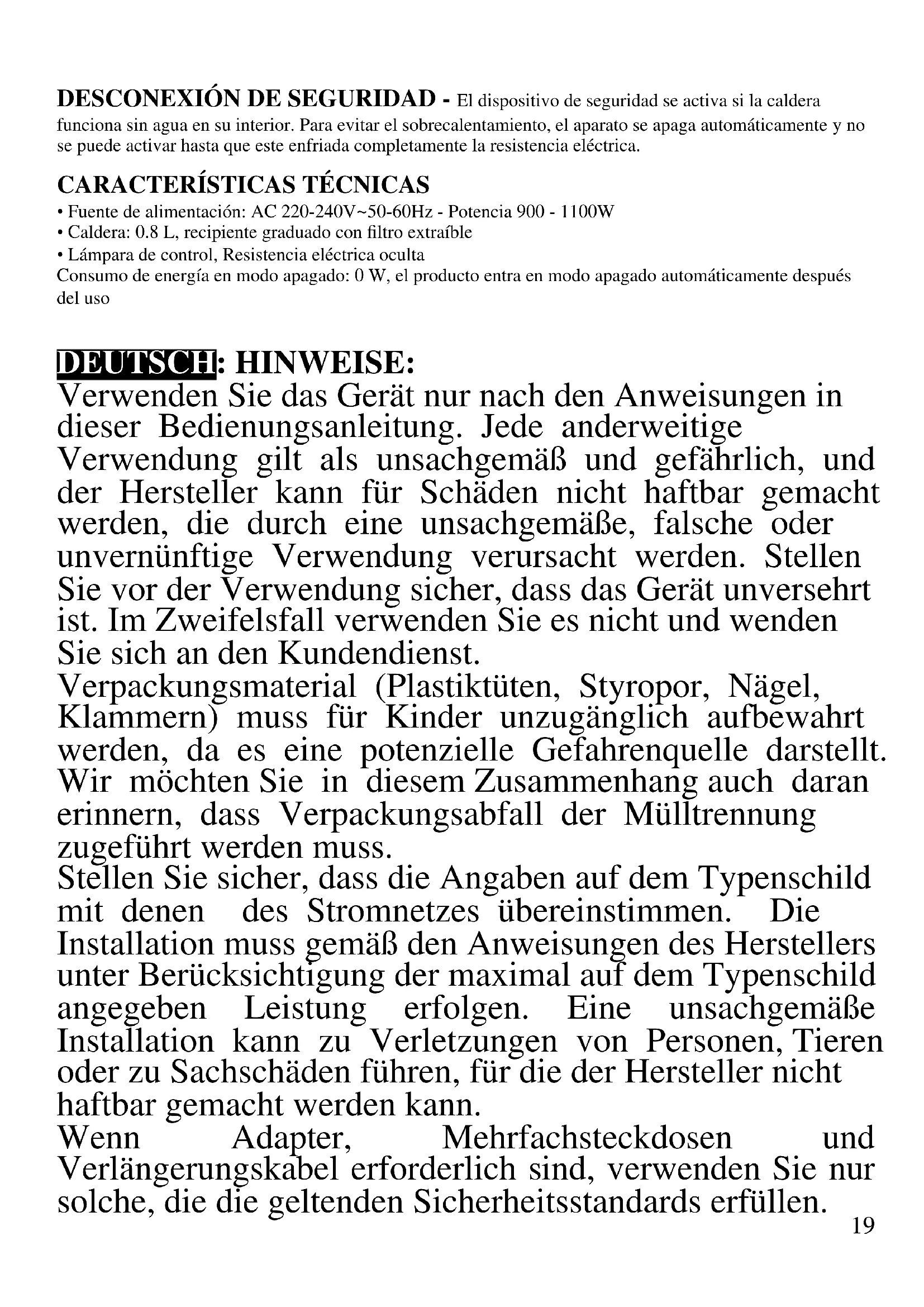 DEUTSCH: HINWEISE: Verwenden Sie das Gerät nur nach den Anweisungen in dieser Bedienungsanleitung. Jede anderweitige Verwendung gilt als unsachgemäß und gefährlich, und der Hersteller kann für Schäden nicht haftbar gemacht werden, die durch eine unsachgemäße, falsche oder unvernünftige Verwendung verursacht werden. Stellen Sie vor der Verwendung sicher, dass das Gerät unversehrt ist. Im Zweifelsfall verwenden Sie es nicht und wenden Sie sich an den Kundendienst. Verpackungsmaterial (Plastiktüten, Styropor, Nägel, Klammern) muss für Kinder unzugänglich aufbewahrt werden, da es eine potenzielle Gefahrenquelle darstellt. Wir möchten Sie in diesem Zusammenhang auch daran erinnern, dass Verpackungsabfall der Mülltrennung zugeführt werden muss. Stellen Sie sicher, dass die Angaben auf dem Typenschild mit denen des Stromnetzes übereinstimmen. Die Installation muss gemäß den Anweisungen des Herstellers unter Berücksichtigung der maximal auf dem Typenschild angegeben Leistung erfolgen. Eine unsachgemäße Installation kann zu Verletzungen von Personen, Tieren oder zu Sachschäden führen, für die der Hersteller nicht haftbar gemacht werden kann. Wenn Adapter, Mehrfachsteckdosen und Verlängerungskabel erforderlich sind, verwenden Sie nur solche, die die geltenden Sicherheitsstandards erfüllen.20 In keinem Fall dürfen die am einfachen Adapter und/oder an den Verlängerungskabeln angegebenen Verbrauchsgrenzen sowie die maximale Leistung überschritten werden, die auf dem Mehrfachadapter angegeben ist. - Verwenden Sie das Netzkabel nicht in der Nähe von scharfen Gegenständen oder heißen Oberflächen und ziehen Sie den Netzstecker nicht am Netzkabel aus der Steckdose. Lassen Sie es nicht von der Arbeitsplatte baumeln, wo ein Kind es halten könnte. Verwenden Sie das Gerät im Falle von Schäden am Netzkabel, Stecker oder im Falle von Kurzschlüssen nicht und lassen Sie es in einer Vertragswerkstatt reparieren. - Setzen Sie das Gerät keinen ungünstigen Wetterbedingungen, wie z. B. Regen, Feuchtigkeit, Frost, aus und bewahren Sie es an einem trockenen Ort auf. Fassen Sie das Gerät nicht mit nassen Händen an und verwenden Sie es nicht barfuß. - Dieses Gerät kann von Kindern ab 8 Jahren und von Personen mit eingeschränkten körperlichen, sensorischen oder geistigen Fähigkeiten oder mangelnder Erfahrung und Kenntnissen verwendet werden, wenn sie beaufsichtigt oder instruiert wurden, um das Gerät sicher zu verwenden und die damit verbundenen Gefahren zu verstehen. Kinder dürfen nicht mit dem Gerät spielen. Reinigung und Benutzerwartung dürfen nicht von Kindern ohne Aufsicht durchgeführt werden. - Kinder dürfen nicht mit dem Gerät spielen. - Bewahren Sie das Gerät und sein Netzanschluss außerhalb der Reichweite von Kinder unter 8 Jahren. - Nicht für den gewerblichen Gebrauch bestimmt. Nur für den Hausgebrauch bestimmt. Im Falle eines Defekts und/oder von Fehlfunktionen das Gerät nicht öffnen. Für Reparaturen wenden Sie sich an21 eine vom Hersteller autorisierte Werkstatt (Vertragswerkstatt) und fordern Sie den Einsatz von Original-Ersatzteilen. Die Nichtbeachtung der obigen Vorschriften kann die Sicherheit beeinträchtigen und zur Folge haben, dass die Garantie erlischt. WARNUNG: Dieses Gerät enthält eine Heizfunktion. Oberflächen, außer die funktionellen Oberflächen können hohe Temperaturen entwickeln. Da die Temperaturen von verschiedene Personen unterschiedlich wahrgenommen werden, sollte dieses Gerät mit VORSICHT verwendet werden. Halten Sie das Gerät ausschließlich auf Griffflächen die abhalten und verwenden Sie solche Hitzeschutzmaßen wie Hitzeschutzhandschuhe oder Topflappen. Dieses Gerät ist nur für den Hausgebrauch oder gleichwertiges bestimmt, in Situationen wie bspw.: Kantinen in kleinen Firmen oder ähnliche Arbeitsumgebungen, von Kunden in Hotels, Motels oder andere Art von touristische Unterkunft, wie ländlicher oder Wohn –Tourismus. Das Gerät darf nicht mit einer Zeitschaltuhr oder mit einem separaten Fernwirksystem betrieben werden Führen Sie vor jedem Gebrauch das Netzkabel aus. Setzen Sie das Produkt keinen Stößen aus, es könnte beschädigt werden. Verwenden Sie nur originale und kompatible Teile und Zubehör. GEBRAUCHSHINWEISE Vor dem ersten Gebrauch die Teile reinigen, die mit Nahrung in Kontakt kommen, d.h. die Innenseite des Wasserkochers. - Das Gerät niemals während des Betriebs unbeaufsichtigt lassen. Den Wasserkocher einzig und allein zum Erwärmen oder Kochen von Wasser benutzen. - Den Wasserkocher nur mit kaltem Wasser füllen, wobei22 darauf geachtet werden muss, dass der auf dem Gerät angegebene maximale Füllstand nicht überschritten wird (max. 0.8L, min. 0.3L). - Immer zuerst das Wasser einfüllen, bevor der Wasserkocher eingeschaltet wird. Niemals Flüssigkeiten nach dem Einschalten einfüllen. - Sollte der Wasserkocher ohne sich darin befindendes Wasser eingeschaltet werden, dann schaltet die eingebaute Sicherheitsvorrichtung das Gerät automatisch ab, um Schäden zu vermeiden. Es wird nicht möglich sein, Wasser zu erwärmen, bis das Heizelement abgekühlt ist. - Nachdem das Wasser den Siedepunkt erreicht hat, den Netzstecker ziehen und das Gerät komplett entleeren, um Verkrustungen am Heizelement zu vermeiden. - Nur für den häuslichen Gebrauch. Nach dem Gebrauch, den Netzstecker ziehen und warten, bis das Gerät komplett abgekühlt ist, bevor es weggestellt oder gereinigt wird. - Das Gerät niemals in Wasser oder anderen Flüssigkeiten eintauchen. Unbedingt vermeiden, dass Wasserspritzer oder Spritzer von anderen Flüssigkeiten das Gerät erreichen. Den Wasserkocher auf stabilen und ebenen Oberflächen abstellen. Das Gerät nicht in der Nähe von brennbaren Materialien, Wärmequellen, kalten Bereichen und Dampf aufbewahren. BL10 1 Deckel 2 Einschalter mit automatischer Rückstellung 3 Griff 4 Basis 5 Wasserkocher 6 durchsichtiges Fenster mit Wasserstandsanzeige 7 Ausguss mit herausnehmbarem Filter