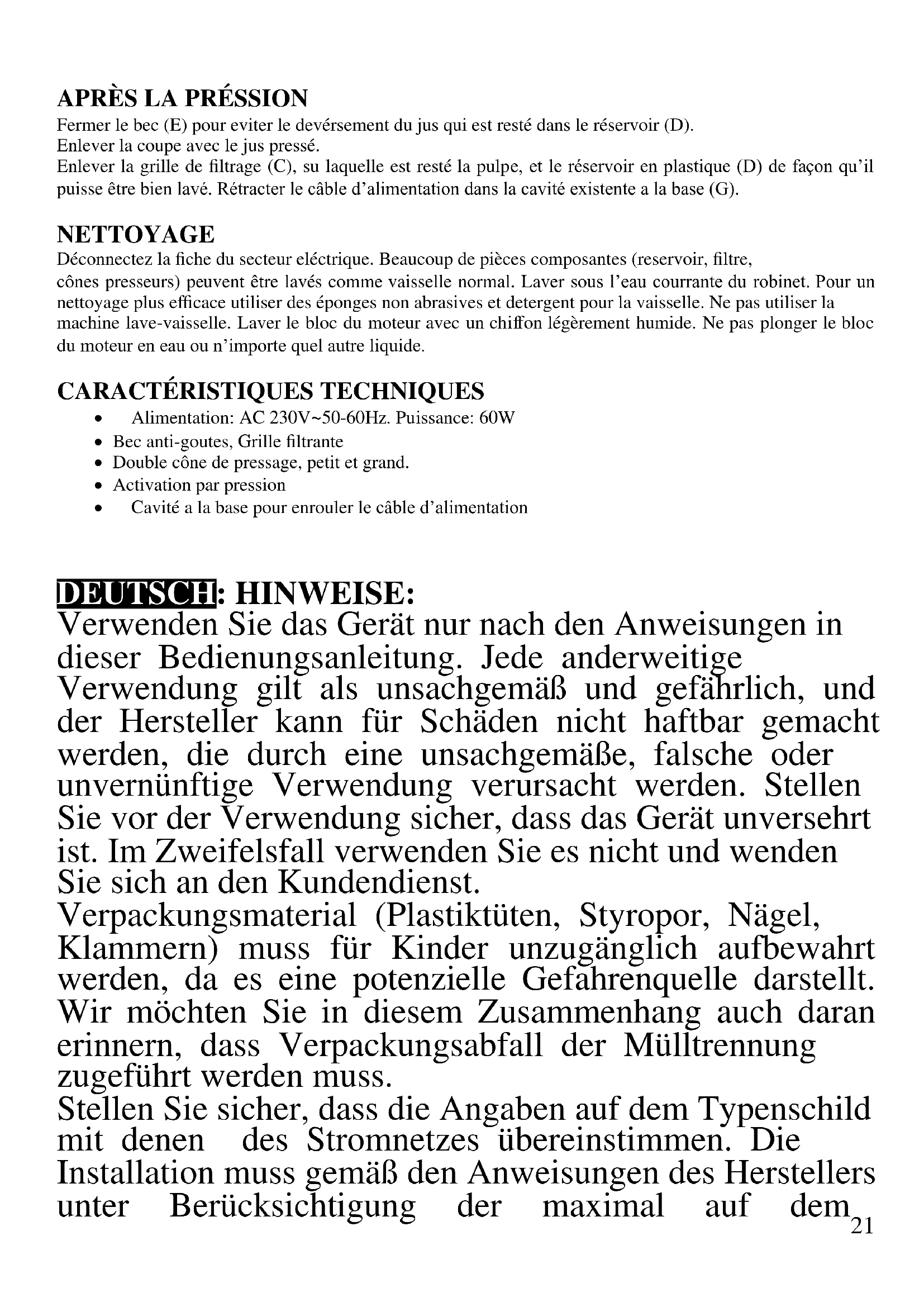 DEUTSCH: HINWEISE: Verwenden Sie das Gerät nur nach den Anweisungen in dieser Bedienungsanleitung. Jede anderweitige Verwendung gilt als unsachgemäß und gefährlich, und der Hersteller kann für Schäden nicht haftbar gemacht werden, die durch eine unsachgemäße, falsche oder unvernünftige Verwendung verursacht werden. Stellen Sie vor der Verwendung sicher, dass das Gerät unversehrt ist. Im Zweifelsfall verwenden Sie es nicht und wenden Sie sich an den Kundendienst. Verpackungsmaterial (Plastiktüten, Styropor, Nägel, Klammern) muss für Kinder unzugänglich aufbewahrt werden, da es eine potenzielle Gefahrenquelle darstellt. Wir möchten Sie in diesem Zusammenhang auch daran erinnern, dass Verpackungsabfall der Mülltrennung zugeführt werden muss. Stellen Sie sicher, dass die Angaben auf dem Typenschild mit denen des Stromnetzes übereinstimmen. Die Installation muss gemäß den Anweisungen des Herstellers unter Berücksichtigung der maximal auf dem22 Typenschild angegeben Leistung erfolgen. Eine unsachgemäße Installation kann zu Verletzungen von Personen, Tieren oder zu Sachschäden führen, für die der Hersteller nicht haftbar gemacht werden kann. Wenn Adapter, Mehrfachsteckdosen und Verlängerungskabel erforderlich sind, verwenden Sie nur solche, die die geltenden Sicherheitsstandards erfüllen. In keinem Fall dürfen die am einfachen Adapter und/oder an den Verlängerungskabeln angegebenen Verbrauchsgrenzen sowie die maximale Leistung überschritten werden, die auf dem Mehrfachadapter angegeben ist. - Verwenden Sie das Netzkabel nicht in der Nähe von scharfen Gegenständen oder heißen Oberflächen und ziehen Sie den Netzstecker nicht am Netzkabel aus der Steckdose. Lassen Sie es nicht von der Arbeitsplatte baumeln, wo ein Kind es halten könnte. Verwenden Sie das Gerät im Falle von Schäden am Netzkabel, Stecker oder im Falle von Kurzschlüssen nicht und lassen Sie es in einer Vertragswerkstatt reparieren. - Setzen Sie das Gerät keinen ungünstigen Wetterbedingungen, wie z. B. Regen, Feuchtigkeit, Frost, aus und bewahren Sie es an einem trockenen Ort auf. Fassen Sie das Gerät nicht mit nassen Händen an und verwenden Sie es nicht barfuß. - Dieses Gerät kann von Kindern ab 8 Jahren und von Personen mit eingeschränkten körperlichen, sensorischen oder geistigen Fähigkeiten oder mangelnder Erfahrung und Kenntnissen verwendet werden, wenn sie beaufsichtigt oder instruiert wurden, um das Gerät sicher zu verwenden und die damit verbundenen Gefahren zu verstehen. Kinder dürfen nicht mit dem Gerät spielen. Reinigung und Benutzerwartung dürfen nicht von Kindern ohne Aufsicht durchgeführt werden.23 - Kinder dürfen nicht mit dem Gerät spielen. - Bewahren Sie das Gerät und sein Netzanschluss außerhalb der Reichweite von Kinder unter 8 Jahren. - Nicht für den gewerblichen Gebrauch bestimmt. Nur für den Hausgebrauch bestimmt. Im Falle eines Defekts und/oder von Fehlfunktionen das Gerät nicht öffnen. Für Reparaturen wenden Sie sich an eine vom Hersteller autorisierte Werkstatt (Vertragswerkstatt) und fordern Sie den Einsatz von Original-Ersatzteilen. Die Nichtbeachtung der obigen Vorschriften kann die Sicherheit beeinträchtigen und zur Folge haben, dass die Garantie erlischt. Dieses Gerät ist nur für den Hausgebrauch oder gleichwertiges bestimmt, in Situationen wie bspw.: Kantinen in kleinen Firmen oder ähnliche Arbeitsumgebungen, von Kunden in Hotels, Motels oder andere Art von touristische Unterkunft, wie ländlicher oder Wohn –Tourismus. Das Gerät darf nicht mit einer Zeitschaltuhr oder mit einem separaten Fernwirksystem betrieben werden Führen Sie vor jedem Gebrauch das Netzkabel aus. Setzen Sie das Produkt keinen Stößen aus, es könnte beschädigt werden. Verwenden Sie nur originale und kompatible Teile und Zubehör. GEBRAUCHSANWEISUNG Waschen Sie beim ersten Mal sorgfältig die Elemente, die mit Lebensmitteln in Berührung kommen: Arm, Filter, Tank für Saft, Schnabel und Presskegel. Prüfen Sie vor dem Anschließen des Geräts, ob die Oberfläche, auf der es aufgestellt ist, stabil und glatt ist. Stellen Sie das Gerät nicht in der Nähe von Wärmequellen auf. Montieren Sie alle Elemente vor der Verwendung richtig. Stellen Sie immer einen Behälter unter den Auslauf, um24 den gegossenen Saft aufzufangen. Verwenden Sie das Gerät nicht länger als 5 Minuten hintereinander, um eine Überhitzung des Motors zu vermeiden. Warten Sie danach mindestens 5 Minuten, bevor Sie es erneut verwenden. Entfernen Sie vor dem Gebrauch des Geräts alle Innen- und Außenverpackungen. Tauchen Sie den Motorblock nicht in Wasser oder andere Flüssigkeiten. Verwenden Sie zum Waschen ein leicht angefeuchtetes Tuch SR54 A) Deckel B) Kleiner und Großer Presskegel C) Filter D) Saftbehälter mit Ausgussschnabel E) Auslaufs F) Motorgehäuse G) Kabelaufwickler Gebrauch - Bevor Einzelteile eingesetzt oder entfernt werden sowie vor der Reinigung des Geräts immer den Stecker aus der Steckdose ziehen, auch wenn das Gerät nicht in Betrieb ist.