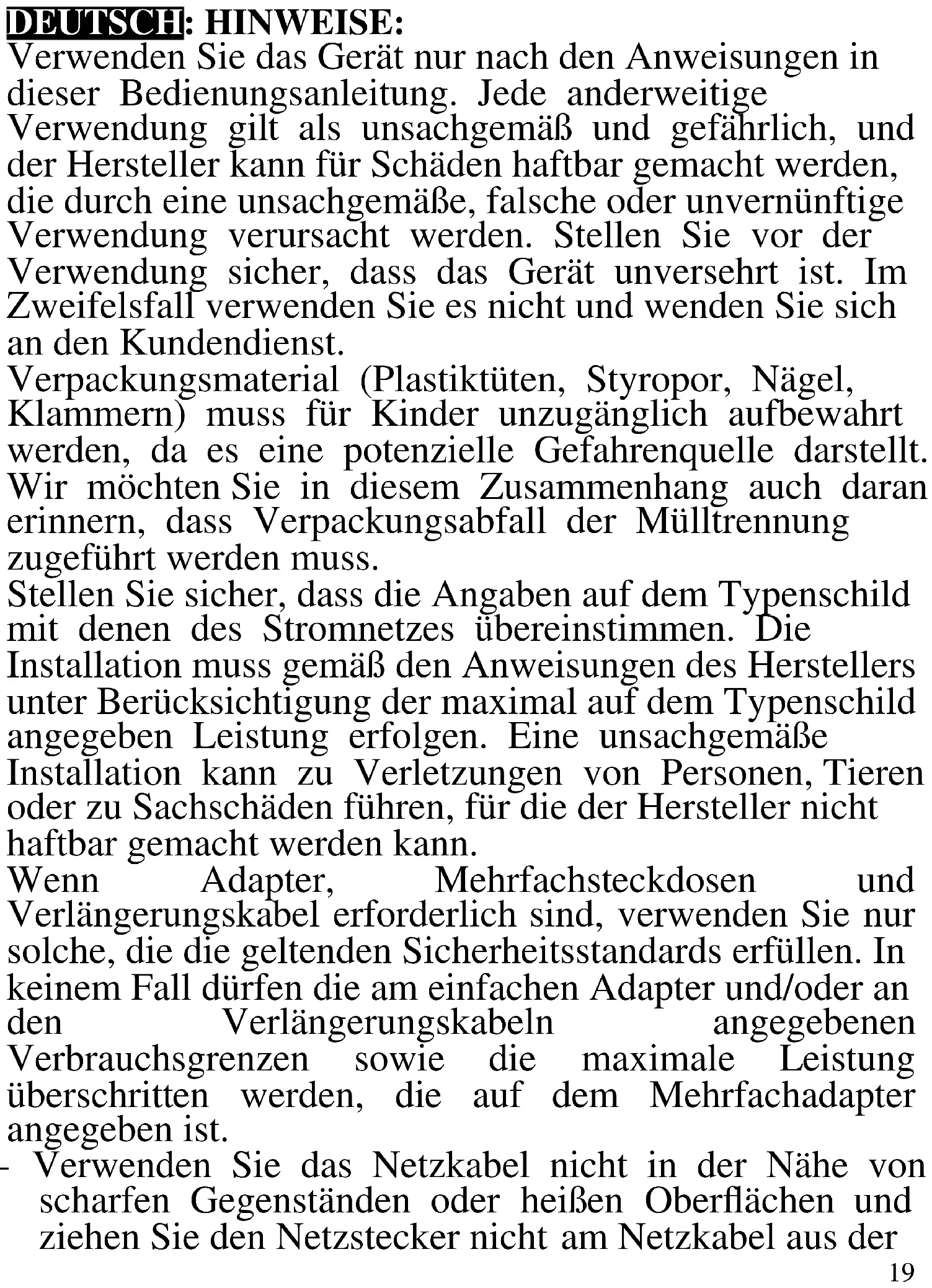 - Tronco extraíble.19 DEUTSCH: HINWEISE: Verwenden Sie das Gerät nur nach den Anweisungen in dieser Bedienungsanleitung. Jede anderweitige Verwendung gilt als unsachgemäß und gefährlich, und der Hersteller kann für Schäden haftbar gemacht werden, die durch eine unsachgemäße, falsche oder unvernünftige Verwendung verursacht werden. Stellen Sie vor der Verwendung sicher, dass das Gerät unversehrt ist. Im Zweifelsfall verwenden Sie es nicht und wenden Sie sich an den Kundendienst. Verpackungsmaterial (Plastiktüten, Styropor, Nägel, Klammern) muss für Kinder unzugänglich aufbewahrt werden, da es eine potenzielle Gefahrenquelle darstellt. Wir möchten Sie in diesem Zusammenhang auch daran erinnern, dass Verpackungsabfall der Mülltrennung zugeführt werden muss. Stellen Sie sicher, dass die Angaben auf dem Typenschild mit denen des Stromnetzes übereinstimmen. Die Installation muss gemäß den Anweisungen des Herstellers unter Berücksichtigung der maximal auf dem Typenschild angegeben Leistung erfolgen. Eine unsachgemäße Installation kann zu Verletzungen von Personen, Tieren oder zu Sachschäden führen, für die der Hersteller nicht haftbar gemacht werden kann. Wenn Adapter, Mehrfachsteckdosen und Verlängerungskabel erforderlich sind, verwenden Sie nur solche, die die geltenden Sicherheitsstandards erfüllen. In keinem Fall dürfen die am einfachen Adapter und/oder an den Verlängerungskabeln angegebenen Verbrauchsgrenzen sowie die maximale Leistung überschritten werden, die auf dem Mehrfachadapter angegeben ist. - Verwenden Sie das Netzkabel nicht in der Nähe von scharfen Gegenständen oder heißen Oberflächen und ziehen Sie den Netzstecker nicht am Netzkabel aus der20 Steckdose. Lassen Sie es nicht von der Arbeitsplatte baumeln, wo ein Kind es halten könnte. Verwenden Sie das Gerät im Falle von Schäden am Netzkabel, Stecker oder im Falle von Kurzschlüssen nicht und lassen Sie es in einer Vertragswerkstatt reparieren. - Setzen Sie das Gerät keinen ungünstigen Wetterbedingungen, wie z. B. Regen, Feuchtigkeit, Frost, aus und bewahren Sie es an einem trockenen Ort auf. Fassen Sie das Gerät nicht mit nassen Händen an und verwenden Sie es nicht barfuß. - Dieses Gerät kann nicht von Kindern verwendet werden, auch wenn diese älter als 8 Jahre sind. - Dieses Gerät kann von Personen mit eingeschränkten körperlichen, sensorischen oder geistigen Fähigkeiten oder mangelnder Erfahrung und Kenntnissen verwendet werden, wenn sie in sicherer Weise beaufsichtigt oder instruiert wurden, wie das Gerät verwendet werden kann, und die damit verbundenen Gefahren verstehen. - Kinder dürfen nicht mit dem Gerät spielen. - Bewahren Sie das Gerät und sein Netzanschluss außerhalb der Reichweite von Kinder unter 8 Jahren. Wenn das Netzkabel beschädigt ist oder wenn ein Fehler vorliegt, darf das Gerät nicht manipuliert werden. Jede Reparatur muss vom Hersteller oder seinem technischen Kundendienst oder in jedem Fall von einer Person mit ähnlicher Qualifikation durchgeführt werden, um jegliches Risiko zu vermeiden. Die Nichtbeachtung der vorstehenden Bestimmungen kann die Sicherheit des Geräts beeinträchtigen und die Garantiebedingungen ungültig machen. Dieses Gerät ist nur für den Hausgebrauch oder gleichwertiges bestimmt, in Situationen wie bspw.: Kantinen in kleinen Firmen oder ähnliche Arbeitsumgebungen, von Kunden in Hotels, Motels oder21 andere Art von touristische Unterkunft, wie ländlicher oder Wohn –Tourismus. Das Gerät darf nicht mit einer Zeitschaltuhr oder mit einem separaten Fernwirksystem betrieben werden Führen Sie vor jedem Gebrauch das Netzkabel aus. Setzen Sie das Produkt keinen Stößen aus, es könnte beschädigt werden. Verwenden Sie nur originale und kompatible Teile und Zubehör. Halten Sie das Gerät fern von brennbaren Materialien, Wärmequellen, Dampf-und kalte Zonen. ANWEISUNGEN Die Mixerklingen sind sehr scharf: achten Sie darauf, während der Reinigung und Entfernung der Zubereitungen sich nicht zu schneiden. Beim ersten Gebrauch des Geräts, waschen Sie mit Sorgfältigkeit die Teile die in Berührung mit den Lebensmittel kommen: Fuß, Zubehör und Messer/Klingen Um die Motorüberhitzung zu vermeiden, das Gerät nicht mehr als 1 Minute ununterbrochen verwenden; in diesem Fall, ein Zwischenraum von mindestens 5 Minuten Ruhe lassen. Das Gerät im Trockenlauf nicht verwenden. Das Gerät niemals während noch verpackt verwenden. Ziehen Sie den Netzstecker von der Steckdose heraus, bevor Sie die Klingen berühren, sei es zum Reinigen oder Nahrung die sich Docht befindet zu entfernen. Ziehen Sie den Stecker von der Steckdose nach der Verwendung und/oder bevor Sie die Klingen berühren, und/oder bevor den Einbauen und abmontieren von irgendeinem Zubehör. Für die Reinigung des Mix Fußes, empfehlen wir die Verwendung von lauwarmes Wasser, mit einem begrenzten Einsatz von Reinigungsmittel, in diesem Fall, gründlich mit Wasser ausspülen. Tauchen sie den oberenteil des Mixers niemals in Wasser22 oder andere Flüssigkeiten; zum Reinigen ein feuchtes Tuch benutzen. BESCHREIBUNG MX02
