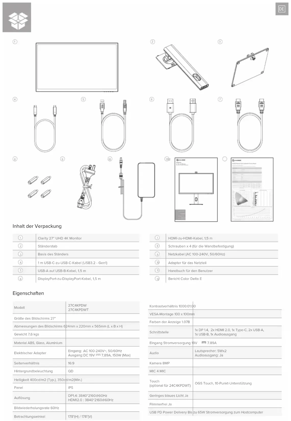 Inhalt der Verpackung Clarity 27” UHD 4K Monitor Ständerstab Basis des Ständers 1 m USB-C-zu-USB-C-Kabel (USB3.2 - Gen1) USB-A auf USB-B-Kabel, 1,5 m DisplayPort-zu-DisplayPort-Kabel, 1,5 m HDMI-zu-HDMI-Kabel, 1,5 m Schrauben x 4 (für die Wandbefestigung) Netzkabel (AC 100-240V, 50/60Hz) Adapter für das Netzteil Handbuch für den Benutzer Bericht Color Delta E