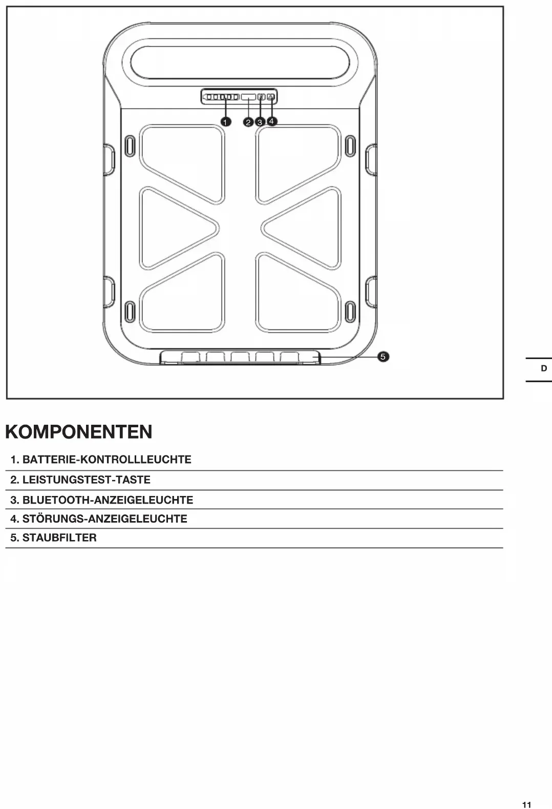 er nicht in das Ladegerät eingesetzt wird oder längere Zeit in einem nicht angeschlossenen Ladegerät verbleibt. Möglicherweise muss er vor der Verwendung wieder aufgeladen werden. Das CyberPack kann mit einem Rucksack verwendet werden; Einzelheiten hierzu nden Sie in der Anleitung für den Rucksack. Wenn während des Auadens des Akkupacks im Ladegerät oder der Verwendung im Gerät eine Überentladung, eine Überladung, eine Übertemperatur oder eine zu niedrige Temperatur festgestellt wird, erscheint eine Fehlermeldung, und das Ladegerät bzw. das Gerät schaltet den Ladevorgang ab. Der Li-Ionen-Akku kann jederzeit aufgeladen werden, ohne seine Lebensdauer zu verkürzen. Die Unterbrechung eines Ladevorgangs wird den Akku nicht beschädigen. Der Ladezustand des Akkus kann an der Akku- Anzeigeleuchte durch Drücken der Leistungstest- Taste abgelesen werden. Drücken Sie vor dem Start oder nach dem Gebrauch die Leistungstest-Taste am Akkupack, um die Akkukapazität zu prüfen. Bemerkungen LED- Leuchte Zustand des Akkus Es leuchten fünf grüne Lämpchen auf. 80% ≤ Leistungspegel ≤ 100% Es leuchten vier grüne Lämpchen auf. 60% ≤ Leistungspegel < 80% Es leuchten drei grüne Lämpchen auf. 40% ≤ Leistungspegel < 60% Es leuchten zwei grüne Lämpchen auf. 20% ≤ Leistungspegel < 40% Es leuchtet ein grünes Lämpchen auf. 10% ≤ Leistungspegel < 20% Ein grünes Licht blinkt. 0% ≤ Leistungspegel < 10% Sie können den jeweiligen Status des Akkus anhand des Status der Bluetooth-Anzeigeleuchte und der Störungs-Anzeigeleuchte erkennen. Bemerkungen Zustand des Akkus Die Bluetooth- Anzeigeleuchte leuchtet. Bluetooth ist verbunden. Die Bluetooth- Anzeigeleuchte leuchtet nicht. Bluetooth ist nicht verbunden. Die Störungs- Anzeigeleuchte leuchtet. Akku defekt, Laden und Entladen verboten. Die Störungs- Anzeigeleuchte leuchtet nicht. Dies ist normal. Wenn der Akkupack defekt ist, leuchtet die Störungs-Anzeigeleuchte auf, und Sie können die spezische Störungsursache und -lösung über die APP ansehen.D