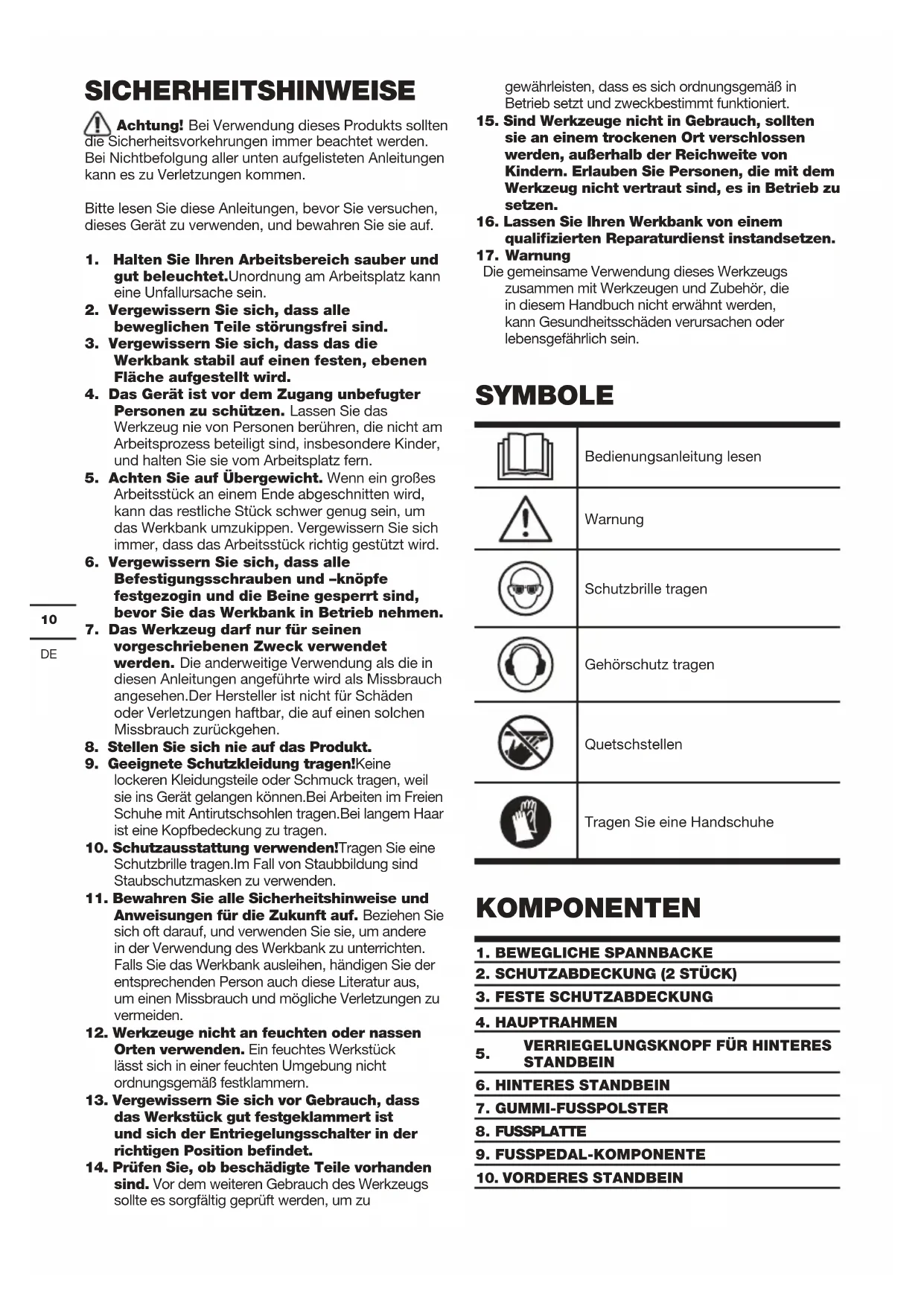 Anweisungen für die Zukunft auf. Beziehen Sie sich oft darauf, und verwenden Sie sie, um andere in der Verwendung des Werkbank zu unterrichten. Falls Sie das Werkbank ausleihen, händigen Sie der entsprechenden Person auch diese Literatur aus, um einen Missbrauch und mögliche Verletzungen zu vermeiden.