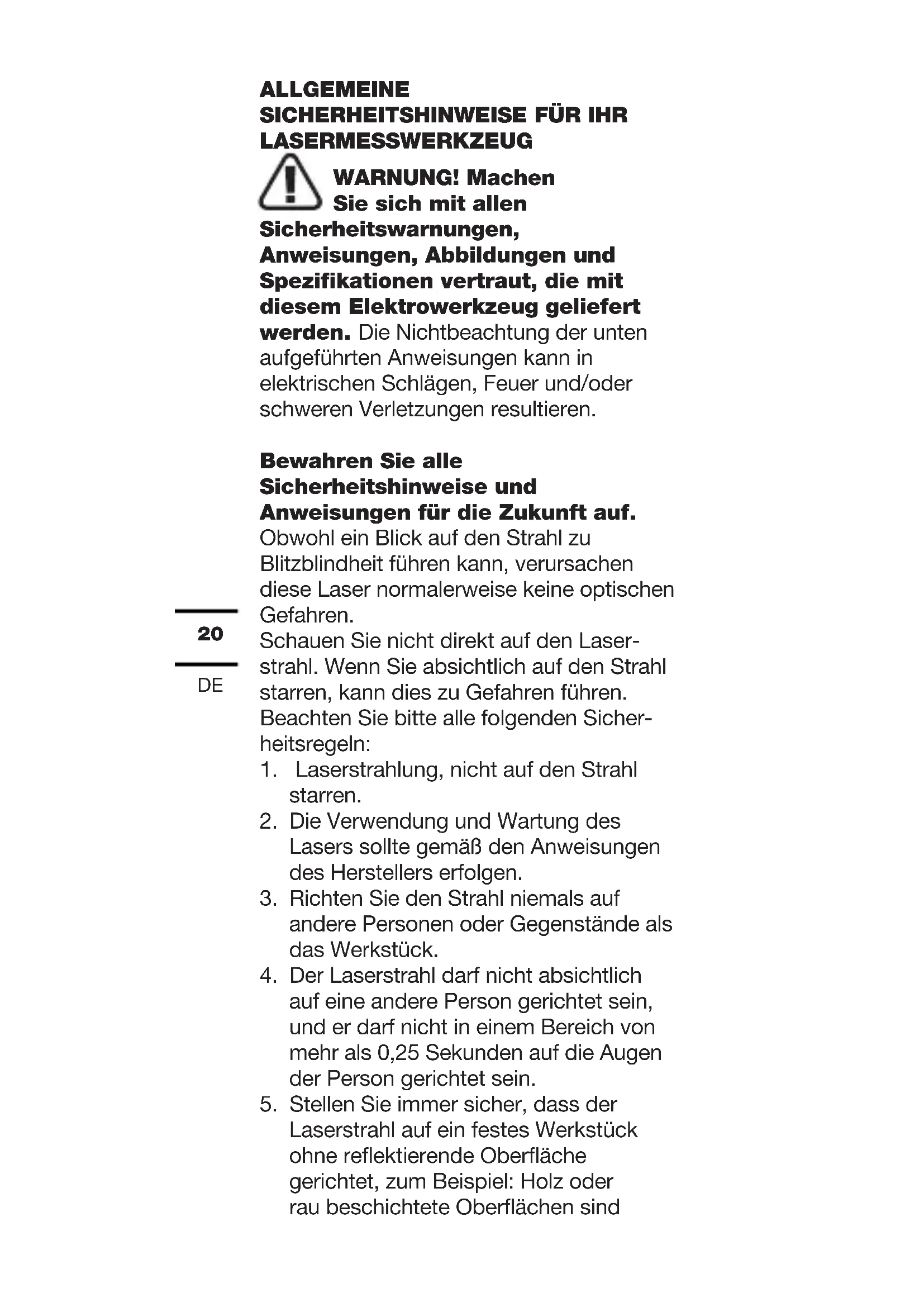 LASERMESSWERKZEUG WARNUNG! Machen Sie sich mit allen Sicherheitswarnungen, Anweisungen, Abbildungen und Spezifikationen vertraut, die mit diesem Elektrowerkzeug geliefert werden. Die Nichtbeachtung der unten aufgeführten Anweisungen kann in elektrischen Schlägen, Feuer und/oder schweren Verletzungen resultieren. Bewahren Sie alle Sicherheitshinweise und Anweisungen für die Zukunft auf. Obwohl ein Blick auf den Strahl zu Blitzblindheit führen kann, verursachen diese Laser normalerweise keine optischen Gefahren. Schauen Sie nicht direkt auf den Laser- strahl. Wenn Sie absichtlich auf den Strahl starren, kann dies zu Gefahren führen. Beachten Sie bitte alle folgenden Sicher- heitsregeln: