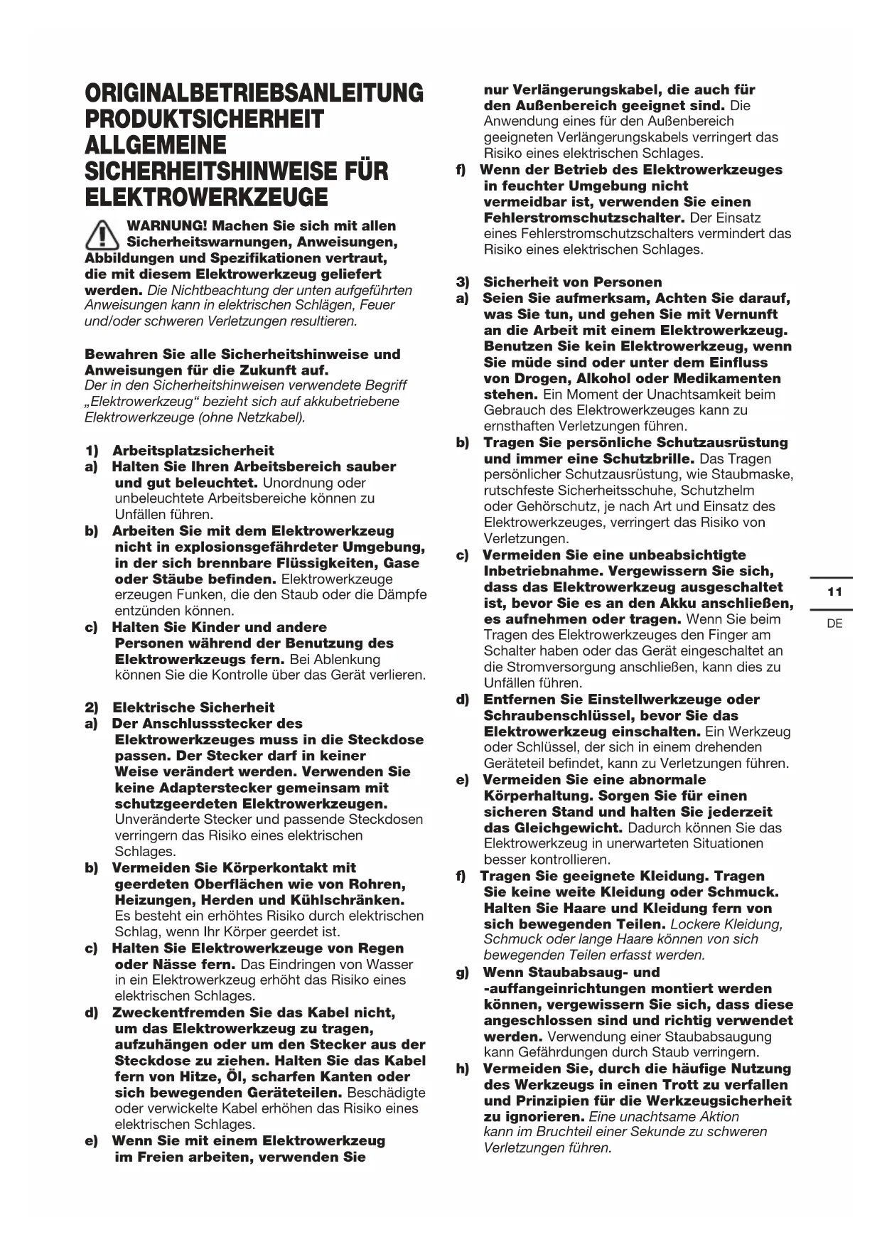 a) Seien Sie aufmerksam, Achten Sie darauf, was Sie tun, und gehen Sie mit Vernunft an die Arbeit mit einem Elektrowerkzeug. Benutzen Sie kein Elektrowerkzeug, wenn Sie müde sind oder unter dem Einfluss von Drogen, Alkohol oder Medikamenten stehen. Ein Moment der Unachtsamkeit beim Gebrauch des Elektrowerkzeuges kann zu ernsthaften Verletzungen führen. b) Tragen Sie persönliche Schutzausrüstung und immer eine Schutzbrille. Das Tragen persönlicher Schutzausrüstung, wie Staubmaske, rutschfeste Sicherheitsschuhe, Schutzhelm oder Gehörschutz, je nach Art und Einsatz des Elektrowerkzeuges, verringert das Risiko von Verletzungen. c) Vermeiden Sie eine unbeabsichtigte Inbetriebnahme. Vergewissern Sie sich, dass das Elektrowerkzeug ausgeschaltet ist, bevor Sie es an den Akku anschließen, es aufnehmen oder tragen. Wenn Sie beim Tragen des Elektrowerkzeuges den Finger am Schalter haben oder das Gerät eingeschaltet an die Stromversorgung anschließen, kann dies zu Unfällen führen. d) Entfernen Sie Einstellwerkzeuge oder Schraubenschlüssel, bevor Sie das Elektrowerkzeug einschalten. Ein Werkzeug oder Schlüssel, der sich in einem drehenden Geräteteil befindet, kann zu Verletzungen führen. e) Vermeiden Sie eine abnormale Körperhaltung. Sorgen Sie für einen sicheren Stand und halten Sie jederzeit das Gleichgewicht. Dadurch können Sie das Elektrowerkzeug in unerwarteten Situationen besser kontrollieren. f) Tragen Sie geeignete Kleidung. Tragen Sie keine weite Kleidung oder Schmuck. Halten Sie Haare und Kleidung fern von sich bewegenden Teilen. Lockere Kleidung, Schmuck oder lange Haare können von sich bewegenden Teilen erfasst werden. g) Wenn Staubabsaug- und -auffangeinrichtungen montiert werden können, vergewissern Sie sich, dass diese angeschlossen sind und richtig verwendet werden. Verwendung einer Staubabsaugung kann Gefährdungen durch Staub verringern. h) Vermeiden Sie, durch die häufige Nutzung des Werkzeugs in einen Trott zu verfallen und Prinzipien für die Werkzeugsicherheit zu ignorieren. Eine unachtsame Aktion kann im Bruchteil einer Sekunde zu schweren Verletzungen führen.12