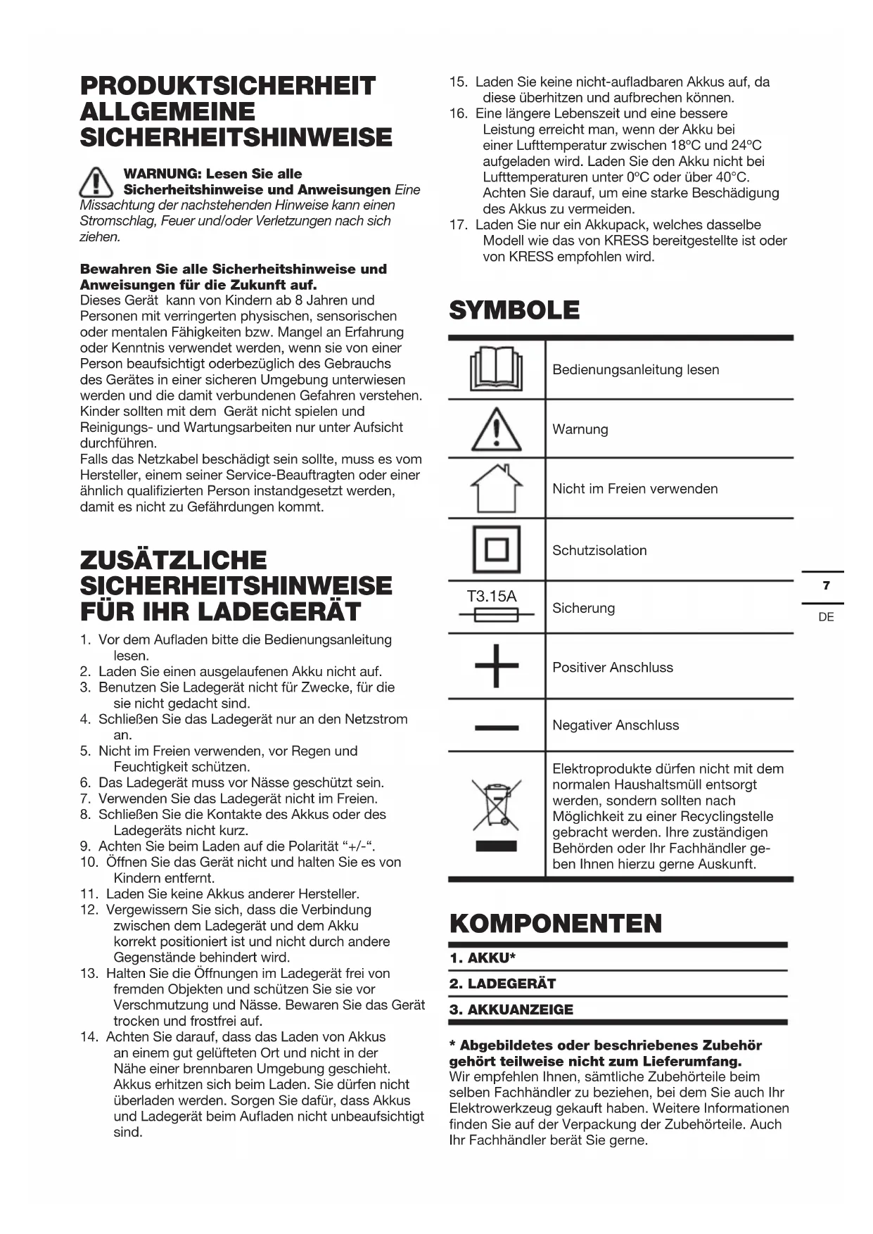 Modell wie das von KRESS bereitgestellte ist oder von KRESS empfohlen wird. SYMBOLE Bedienungsanleitung lesen Warnung Nicht im Freien verwenden Schutzisolation T3.15A Sicherung Positiver Anschluss Negativer Anschluss Elektroprodukte dürfen nicht mit dem normalen Haushaltsmüll entsorgt werden, sondern sollten nach Möglichkeit zu einer Recyclingstelle gebracht werden. Ihre zuständigen Behörden oder Ihr Fachhändler ge- ben Ihnen hierzu gerne Auskunft. KOMPONENTEN