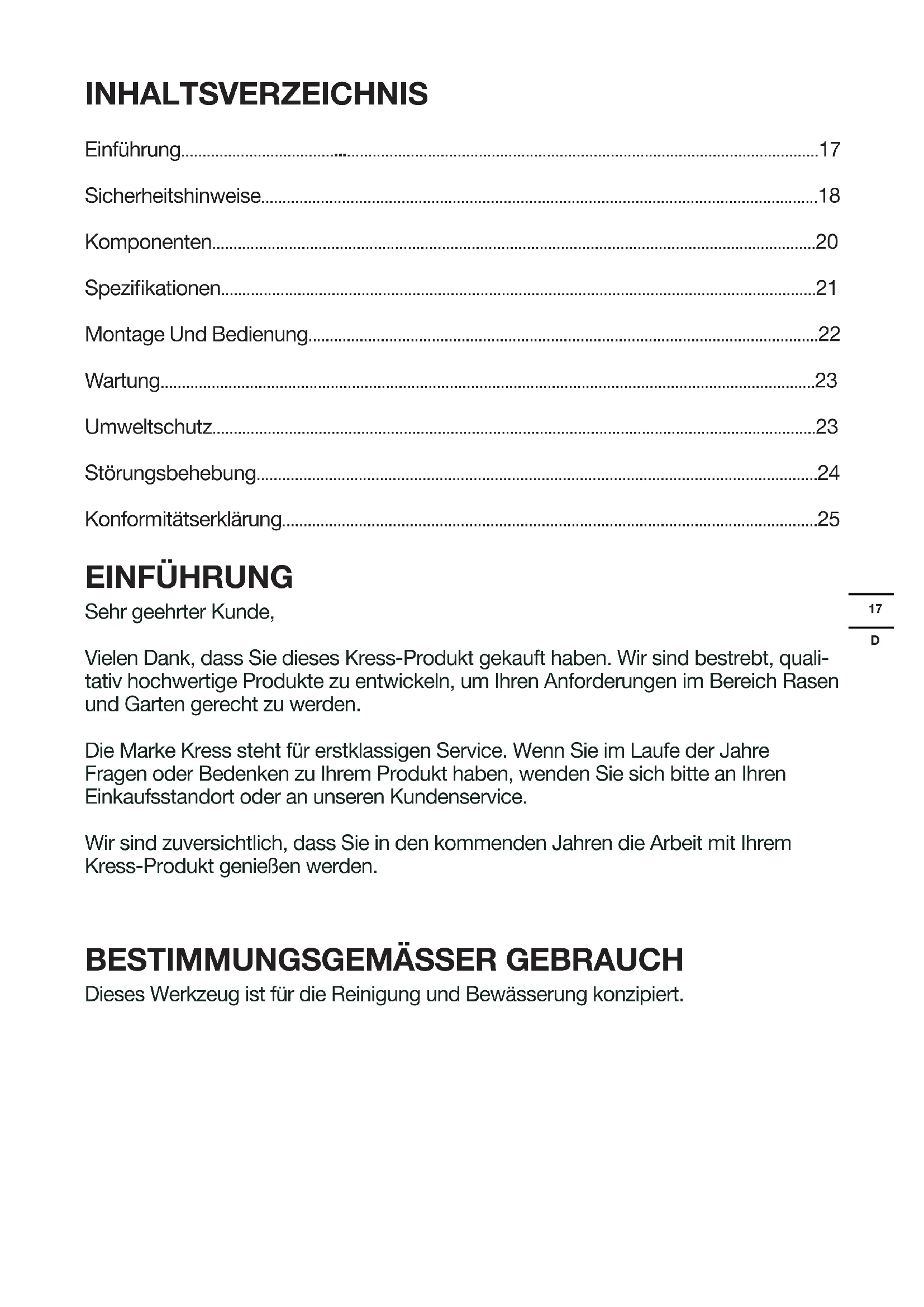 - Konformitätserklärung EINFÜHRUNG Sehr geehrter Kunde, Vielen Dank, dass Sie dieses Kress-Produkt gekauft haben. Wir sind bestrebt, quali- tativ hochwertige Produkte zu entwickeln, um Ihren Anforderungen im Bereich Rasen und Garten gerecht zu werden. Die Marke Kress steht für erstklassigen Service. Wenn Sie im Laufe der Jahre Fragen oder Bedenken zu Ihrem Produkt haben, wenden Sie sich bitte an Ihren Einkaufsstandort oder an unseren Kundenservice. Wir sind zuversichtlich, dass Sie in den kommenden Jahren die Arbeit mit Ihrem Kress-Produkt genießen werden. p. 25