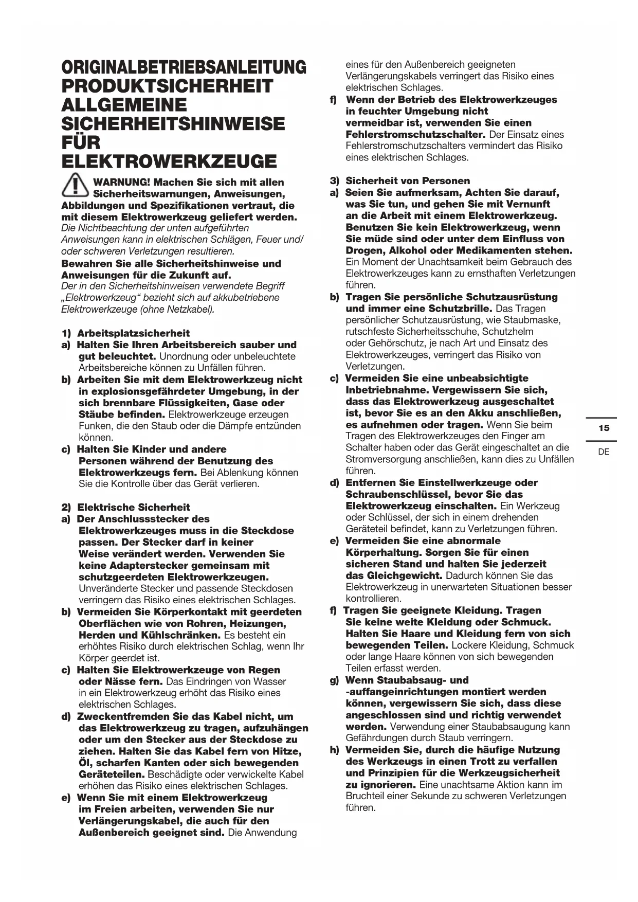 ORIGINALBETRIEBSANLEITUNG PRODUKTSICHERHEIT ALLGEMEINE SICHERHEITSHINWEISE FÜR ELEKTROWERKZEUGE WARNUNG! Machen Sie sich mit allen Sicherheitswarnungen, Anweisungen, Abbildungen und Spezifikationen vertraut, die mit diesem Elektrowerkzeug geliefert werden. Die Nichtbeachtung der unten aufgeführten Anweisungen kann in elektrischen Schlägen, Feuer und/ oder schweren Verletzungen resultieren. Bewahren Sie alle Sicherheitshinweise und Anweisungen für die Zukunft auf. Der in den Sicherheitshinweisen verwendete Begriff „Elektrowerkzeug“ bezieht sich auf akkubetriebene Elektrowerkzeuge (ohne Netzkabel).